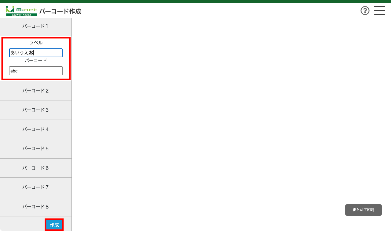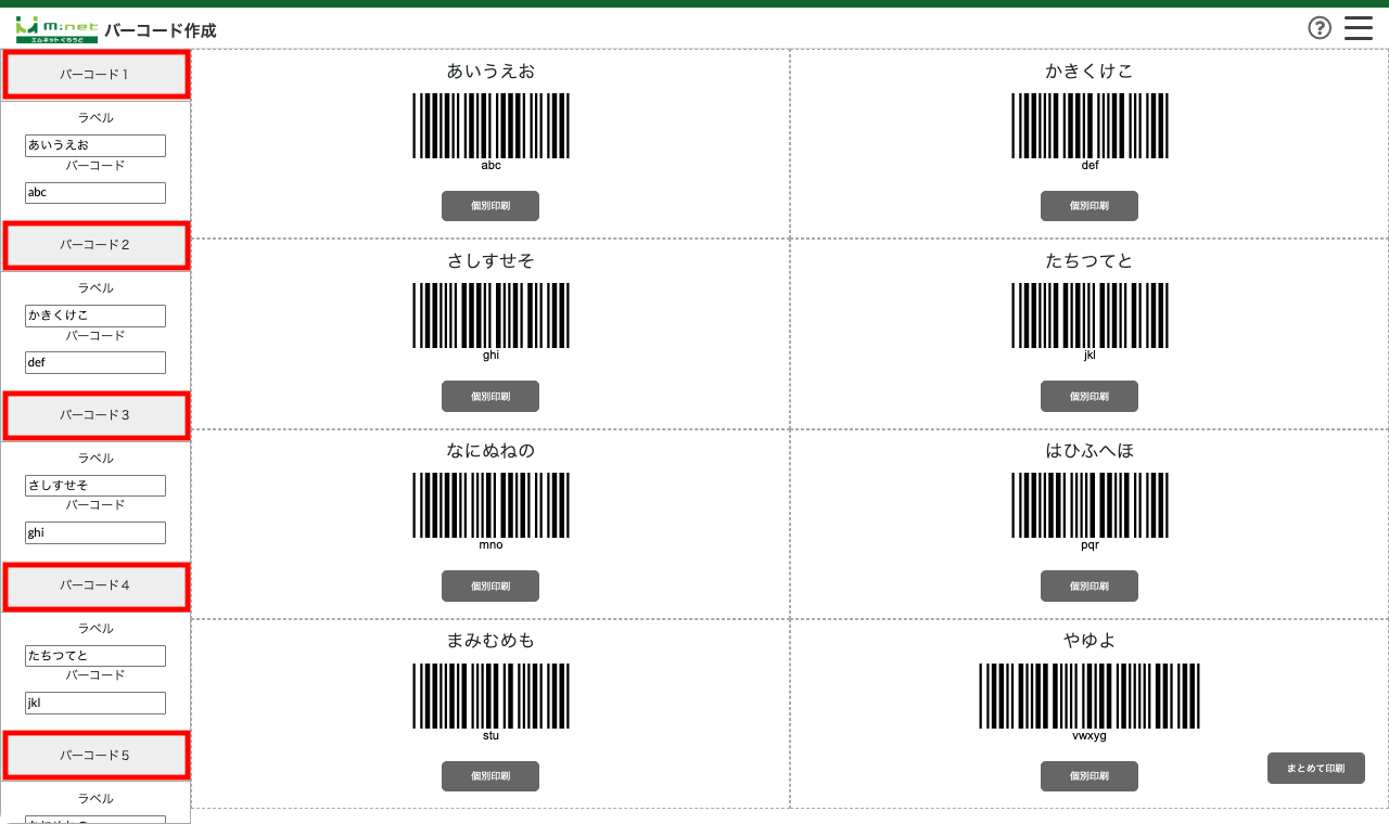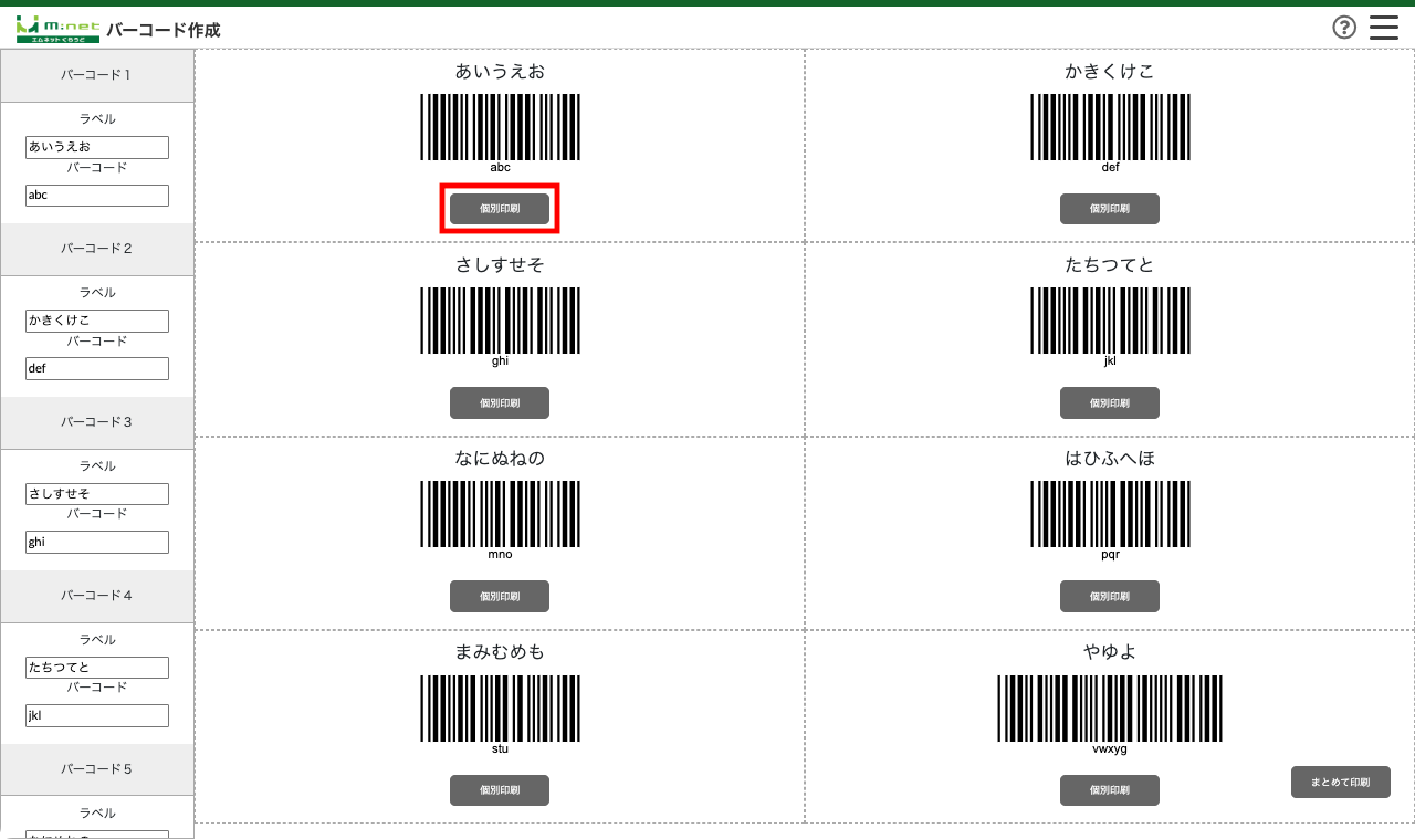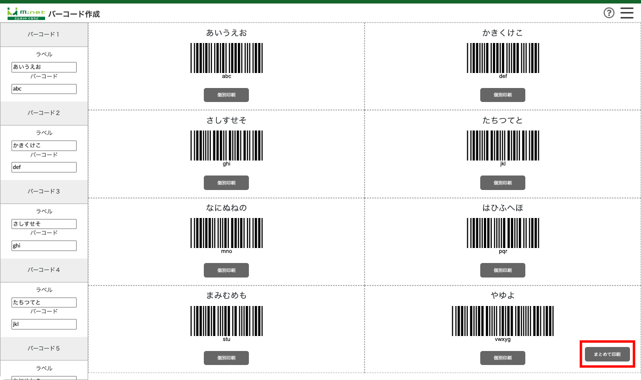 バーコードをまとめて印刷したい場合は、画面右下にある「まとめて印刷」ボタンをクリックしてください。