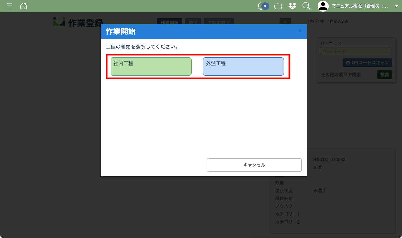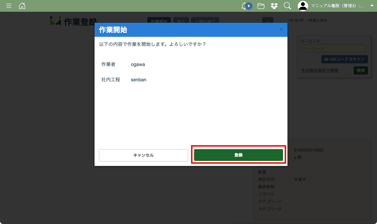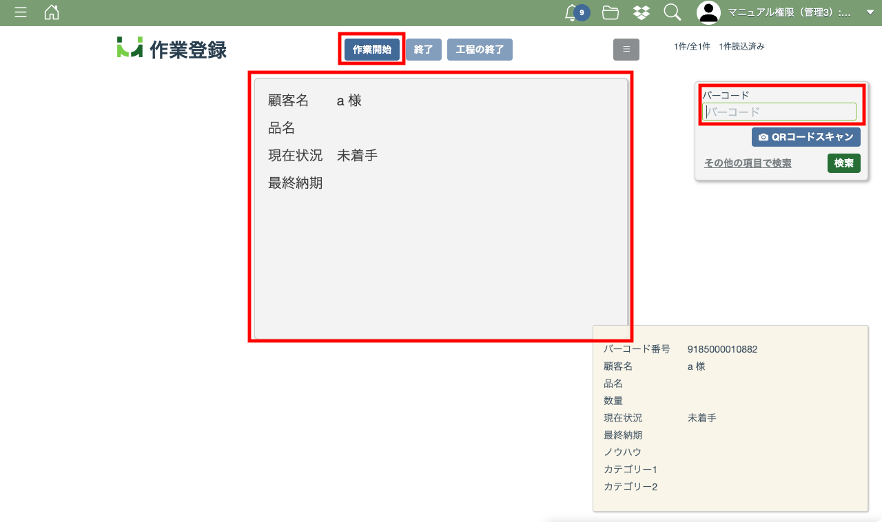 バーコードを読み込んで案件が表示されたら「作業開始」ボタンなどで作業登録を開始します。