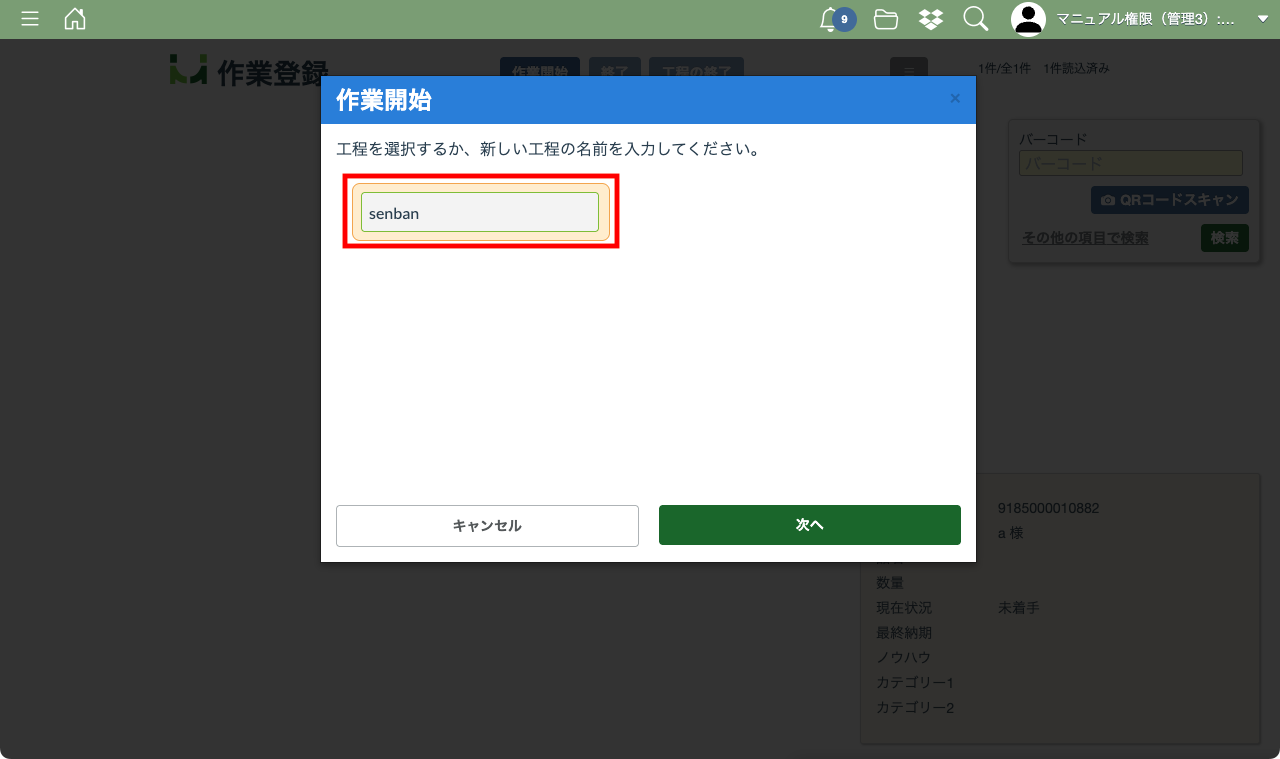 バーコード作成ページで作成しておいた「工程用のバーコード」を読み込むと、工程名が入力されます。