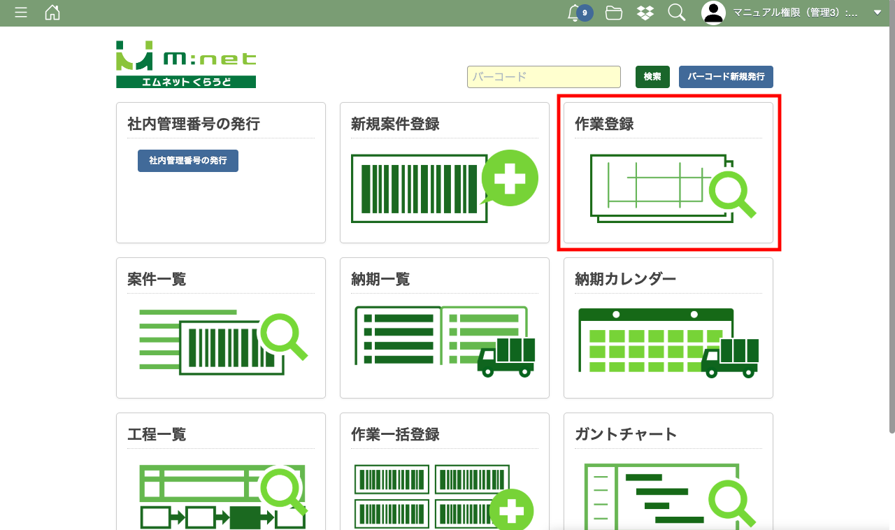 エムネットくらうどのメニューの「作業登録」をクリックして作業登録画面を開きます。