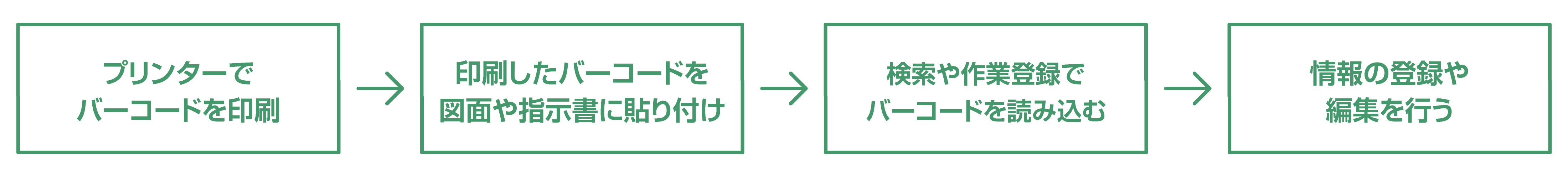個別品目のバーコード番号を印刷して、このバーコードも図面や指示書などに貼り付けます。作業登録画面や工程一覧画面などこのバーコードを読み込むだけで情報をすぐに表示することができます。