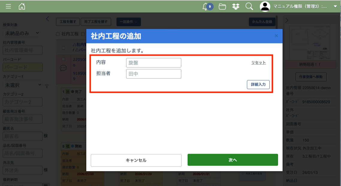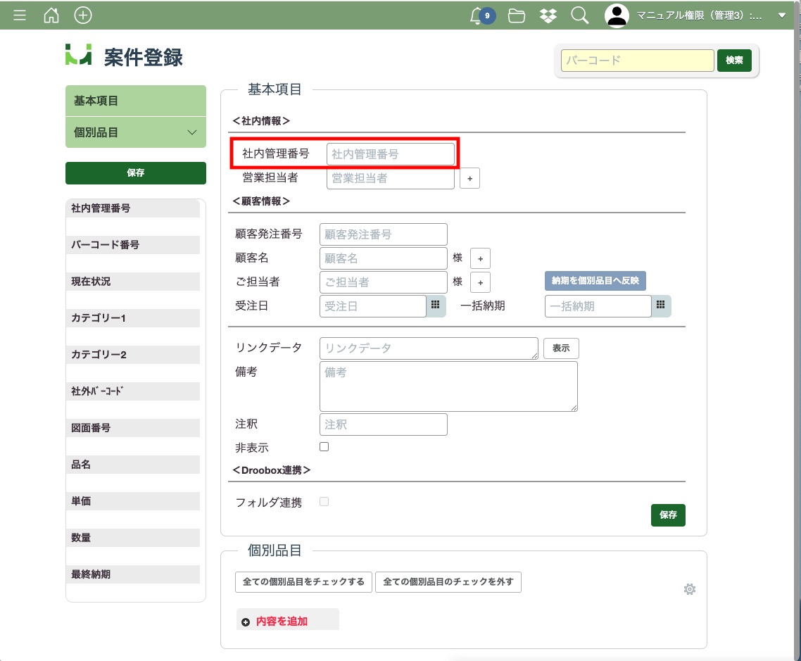 「案件登録」で顧客名や受注日、納期などの基本項目を設定すると、自動的に案件に「社内管理番号」が発行されます。(エムネットくらうどでは案件登録画面からだけでなく、工程一覧やガントチャートの画面からも簡単登録機能で登録してバーコードを発行できます)