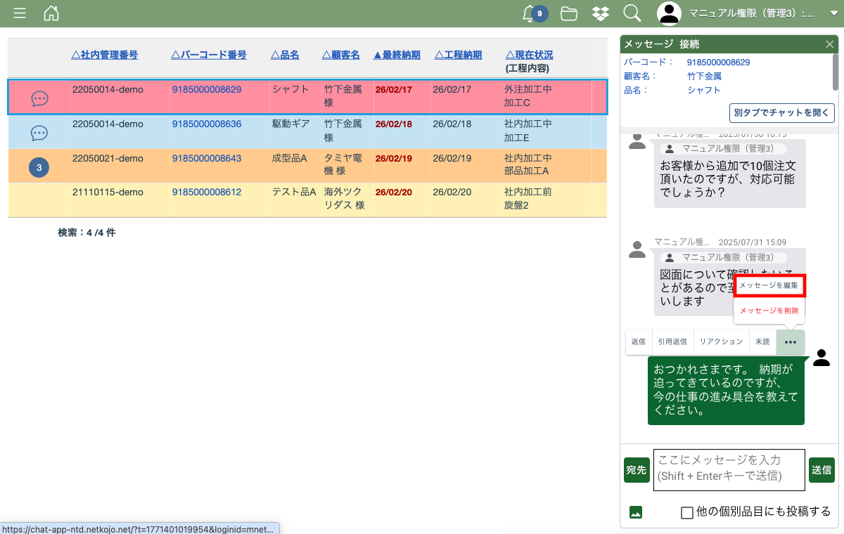 チャット機能で一度送ったメッセージの内容や宛先を編集できます。