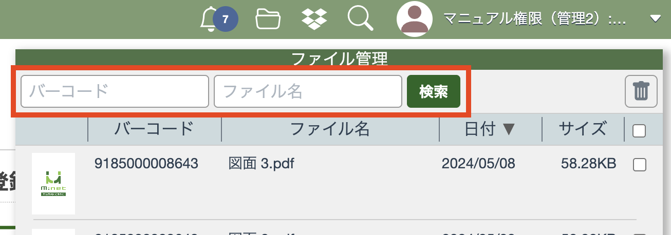 ファイル管理の画面では、ファイルが添付されたチャットのバーコード番号、ファイル名、添付された日付、サイズなどの情報が確認できます。