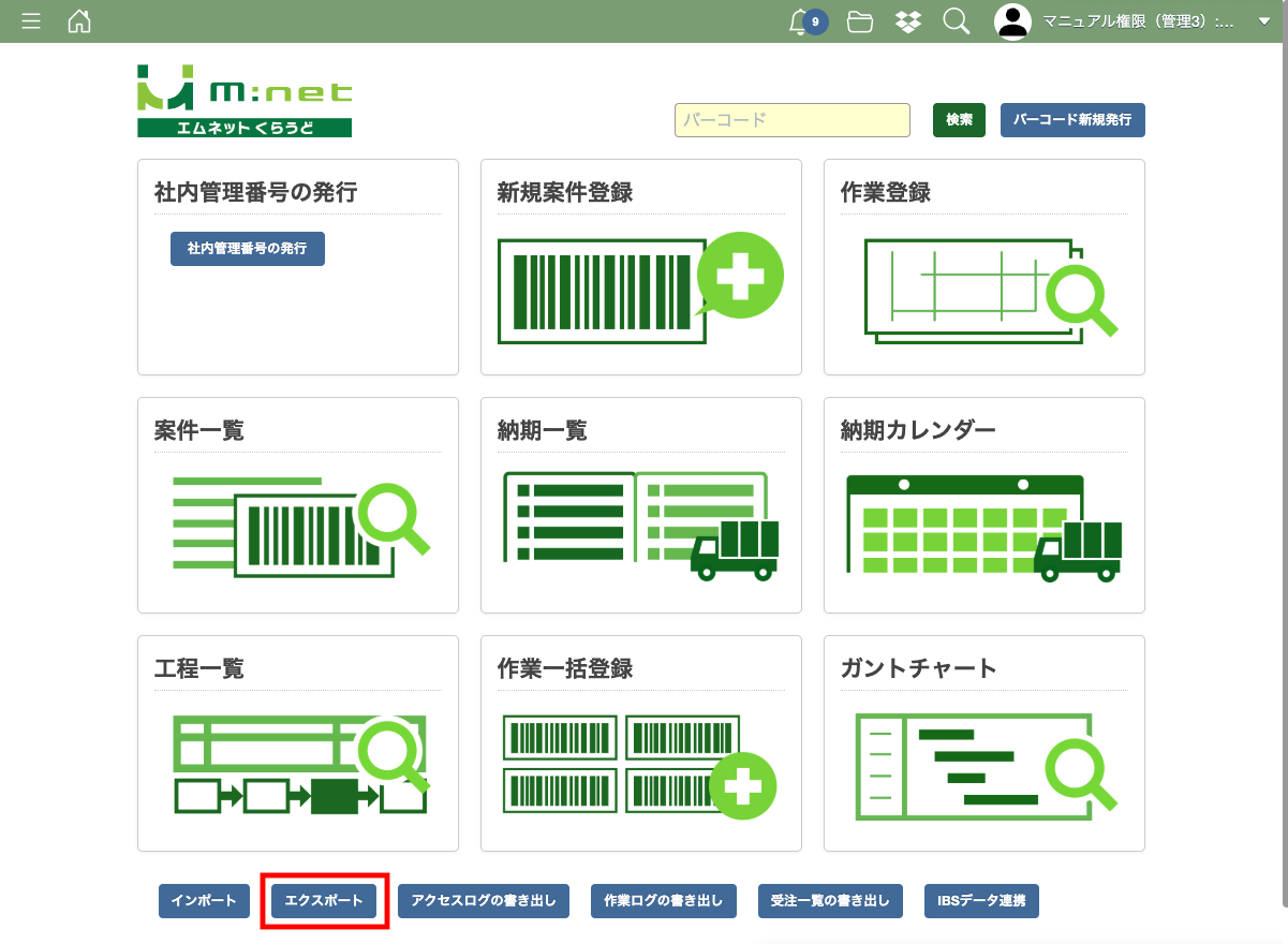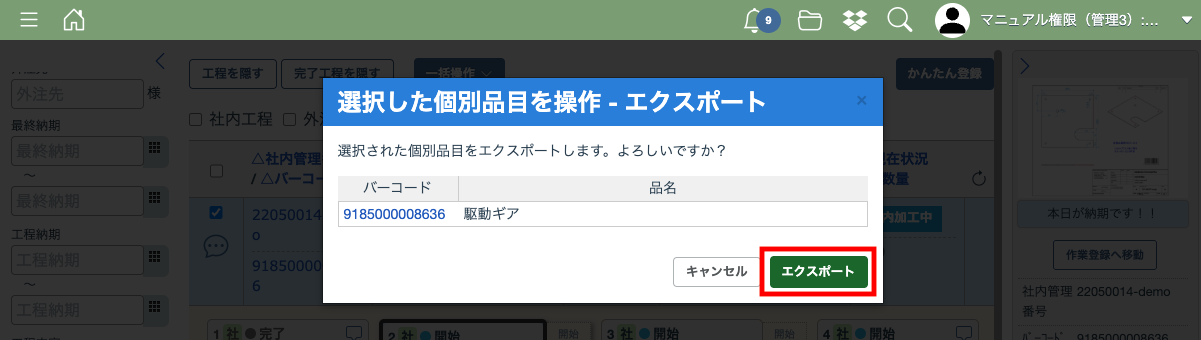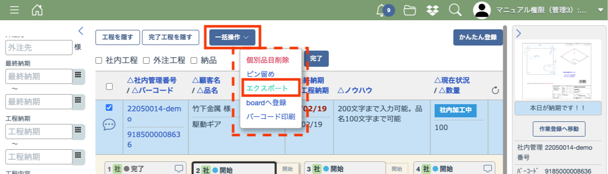 エクスポートはメニュー画面または工程一覧画面から行えますので、目的に応じて使い分けてください。