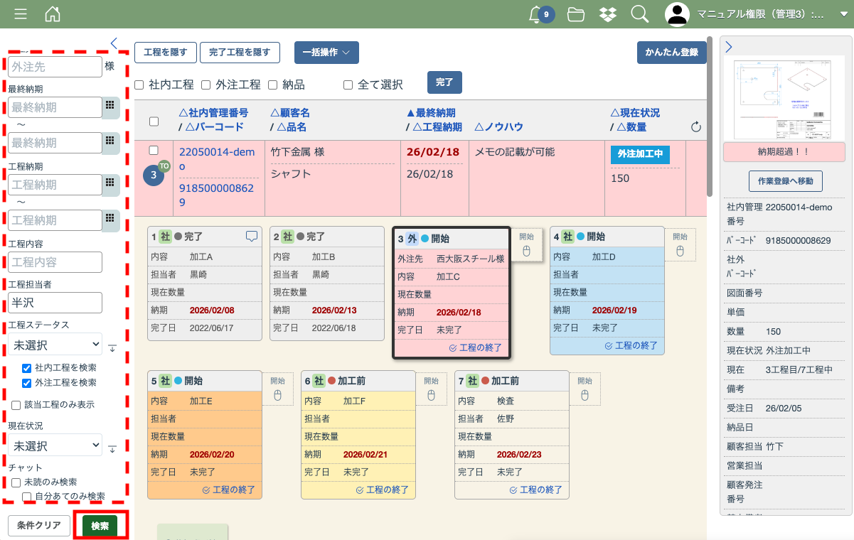 工程一覧画面左側の検索欄から、カテゴリー等の条件を指定してエクスポートしたい案件を検索して表示してください。