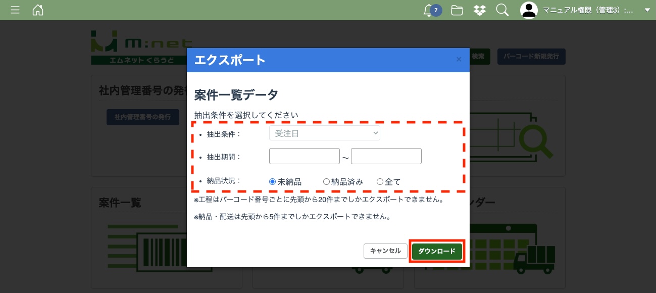 抽出条件、抽出期間、納品状況を選択し、「ダウンロード」ボタンを押してください。