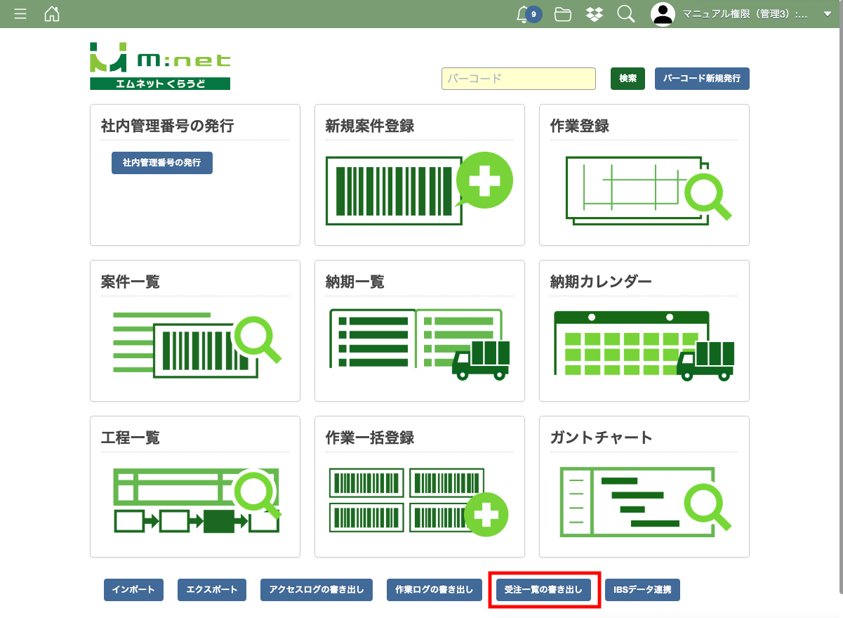 メニュー画面の下部にある「受注一覧の書き出し」ボタンを押します。