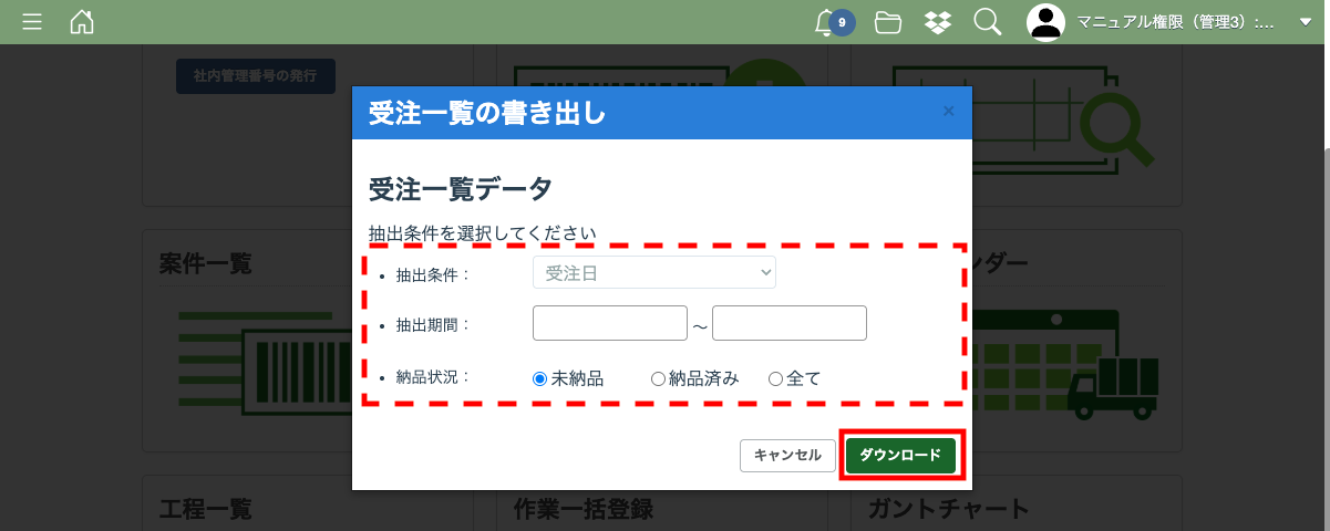 受注一覧は個別品目と工程の情報をCSVで書き出す機能です。抽出条件、抽出期間、納品状況などの条件を適宜設定してcsvファイルをダウンロードすることができます。