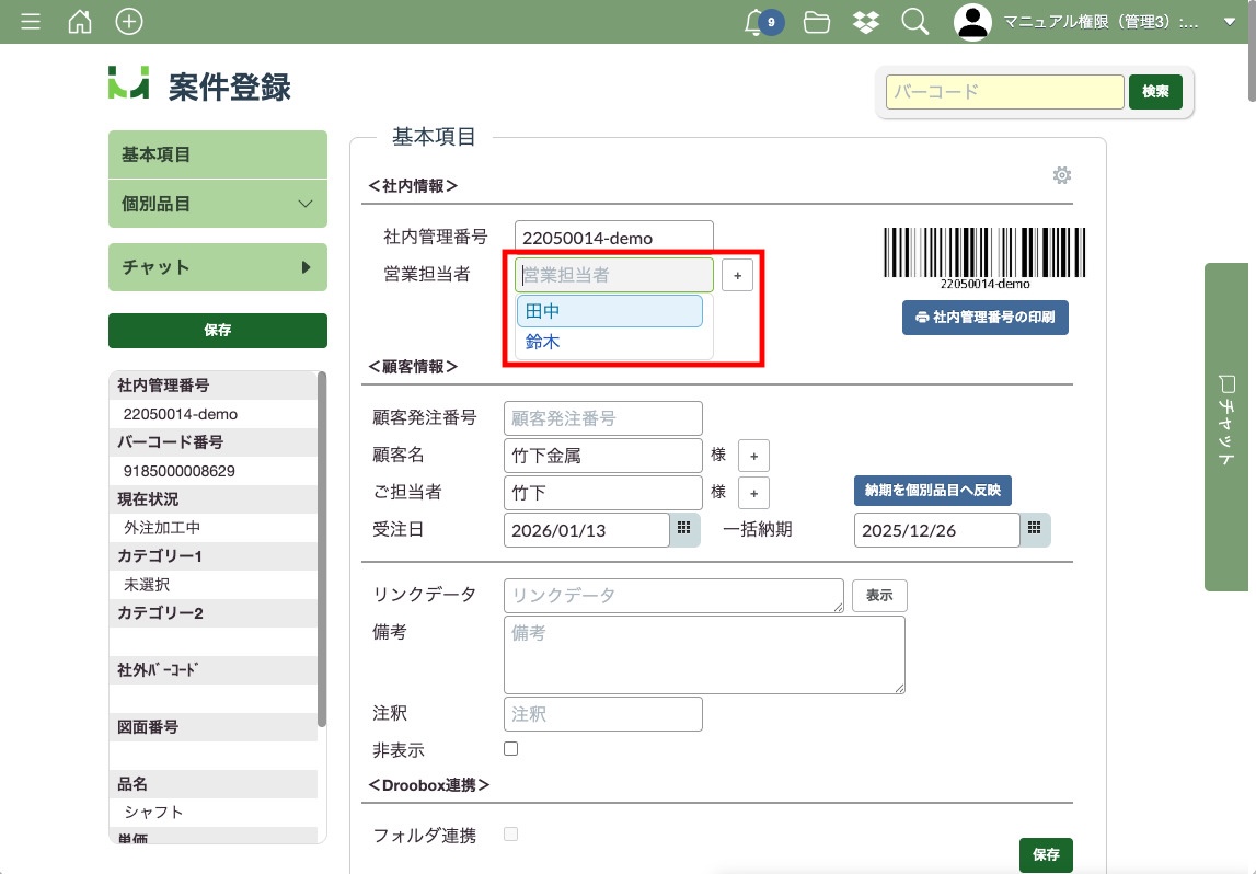 ここでは全ての項目にチェックを入れたので、「社内担当者」から「作業者」までの全ての項目がタブで表示されています。