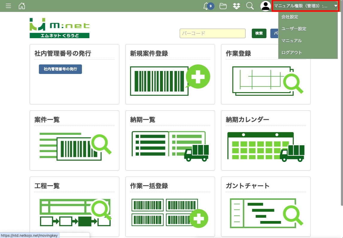 ログインができたら画面右上のユーザー名にカーソルを合わせてください。するとメニューが表示されます。