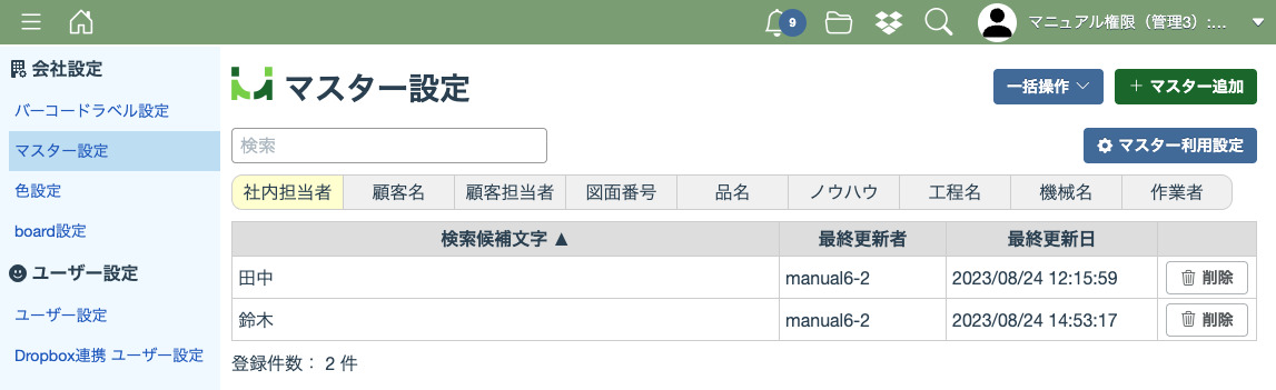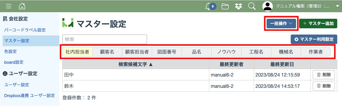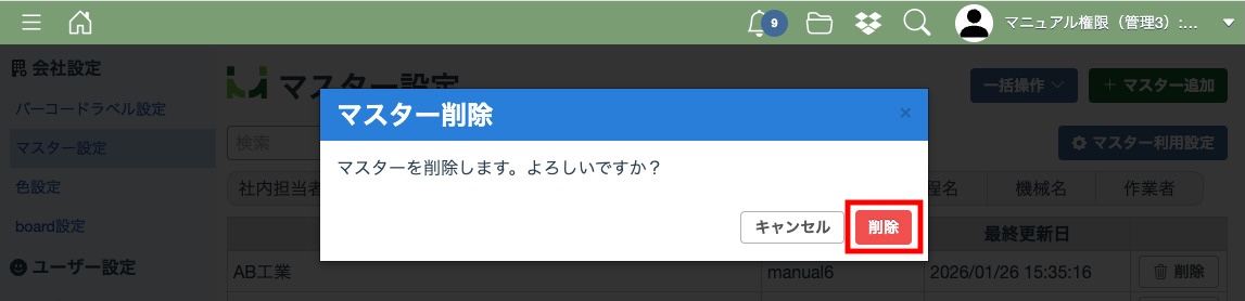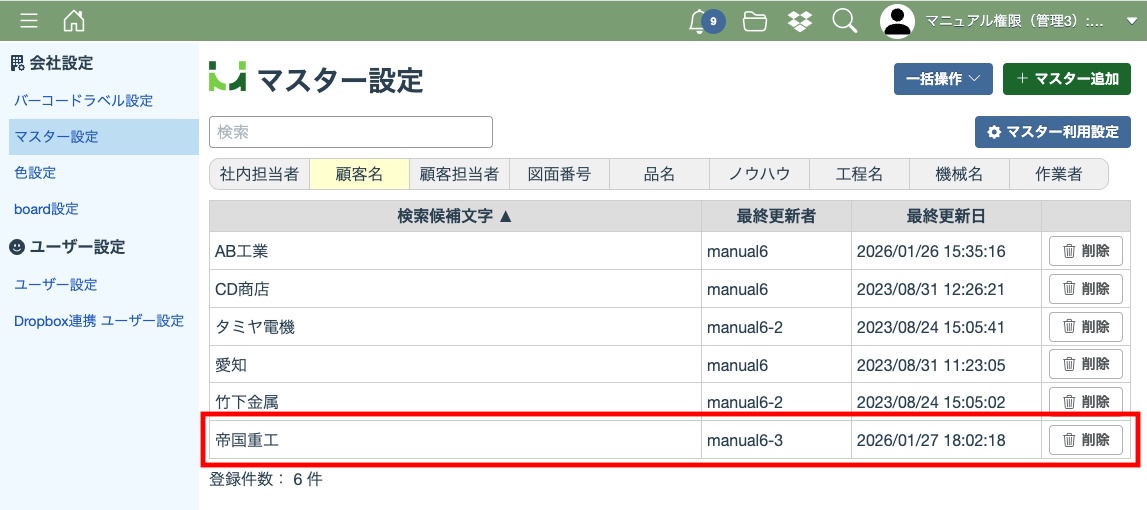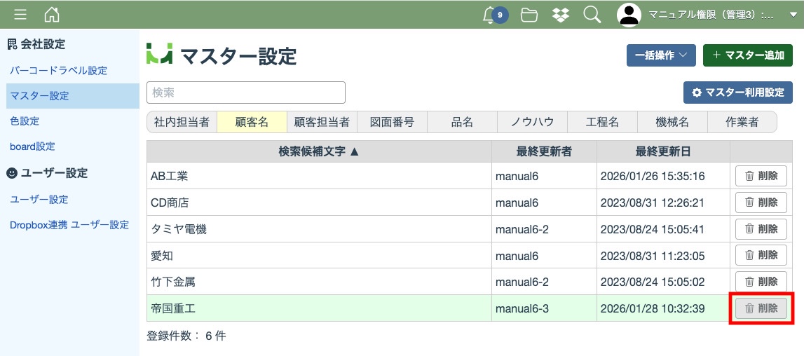 「一括削除」をクリックすると、表示中のマスター情報が削除されます。