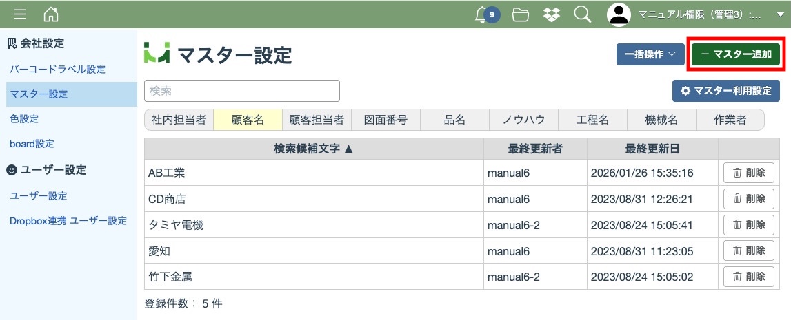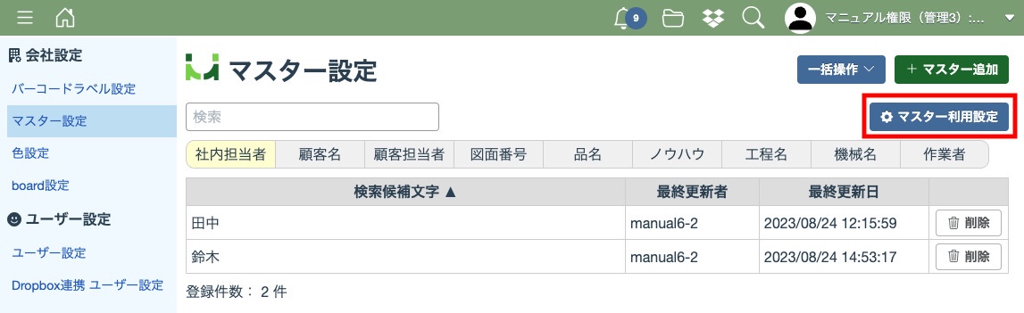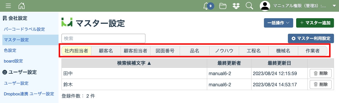 マスター利用設定が完了すると選択した項目のタブが表示されるようになります。