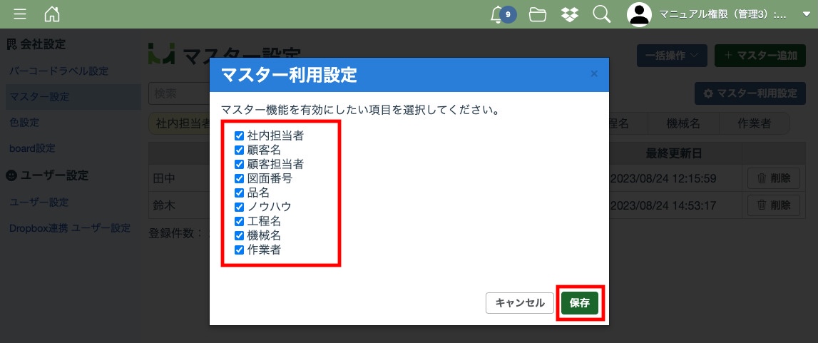 マスター利用設定の画面が表示されたら、マスター機能を有効にしたい項目のチェックボックスにチェックを入れてください。チェックを入れたら「保存」ボタンをクリックしてください。