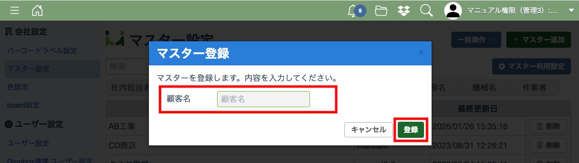 マスター登録画面が表示されるので、ここに登録したい情報を入力して「登録」ボタンを押してください。