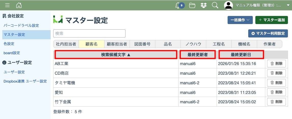 マスター情報の一覧は「検索候補文字」の昇順で表示されています。