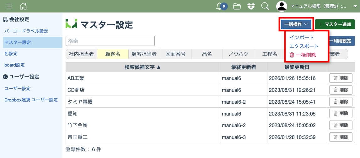 マスター情報の各項目は一括操作(インポート/エクスポート/削除)ができます。