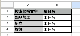 各列の見出し(検索候補文字|項目名)を入力します。2行目以降