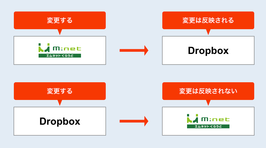 ただしDropbox上でフォルダ名を変更したりフォルダの階層(構造)を変更しても、エムネットくらうどには反映されません。エムネットくらうど上で添付ファイルのリンク切れなどが発生する場合がありますので、Dropbox内のファイルは慎重に取り扱っていただくようお願いいたします。