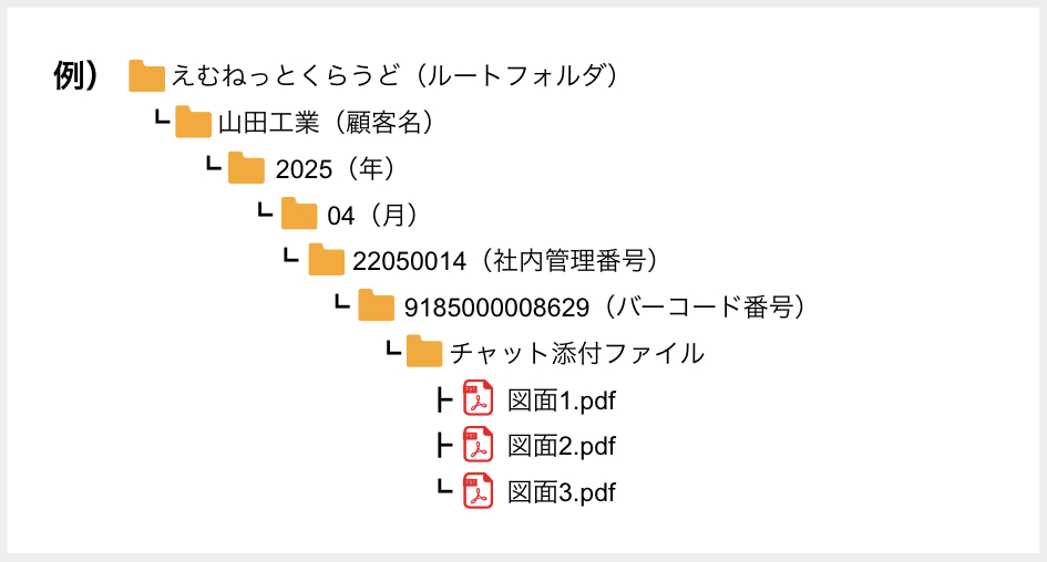 ルートフォルダ / 顧客名 / 年 / 月 / 社内管理番号 / バーコード番号 / チャット添付ファイル