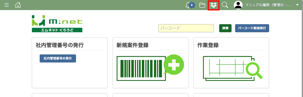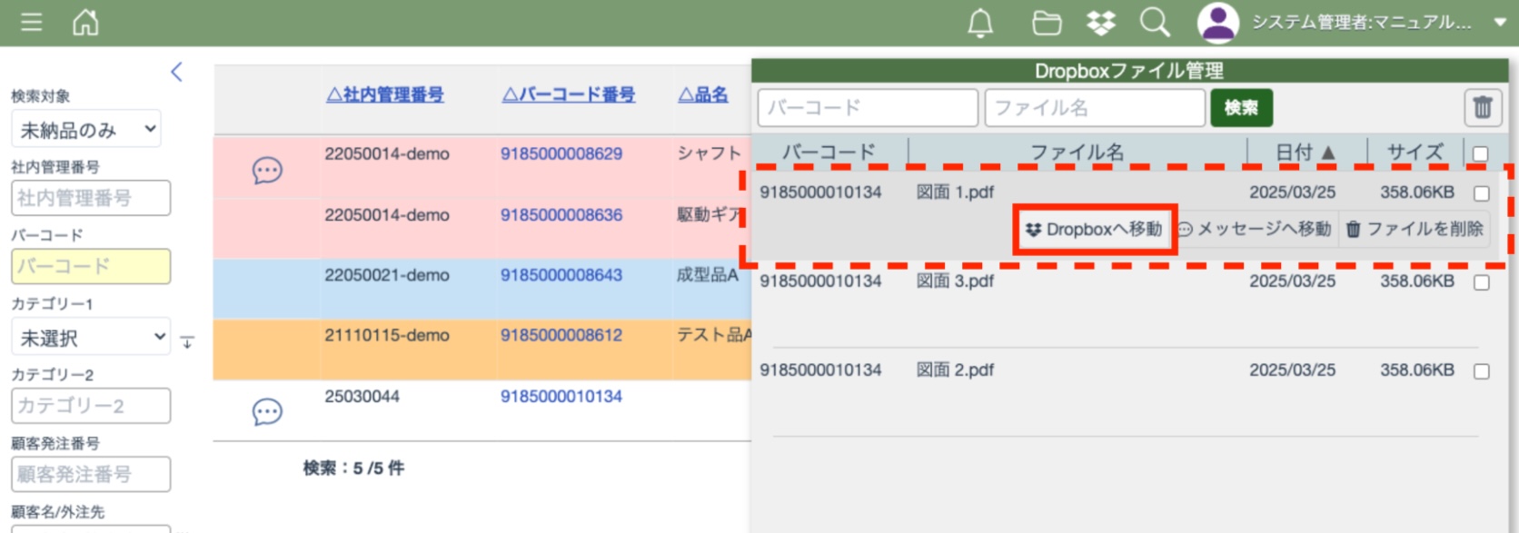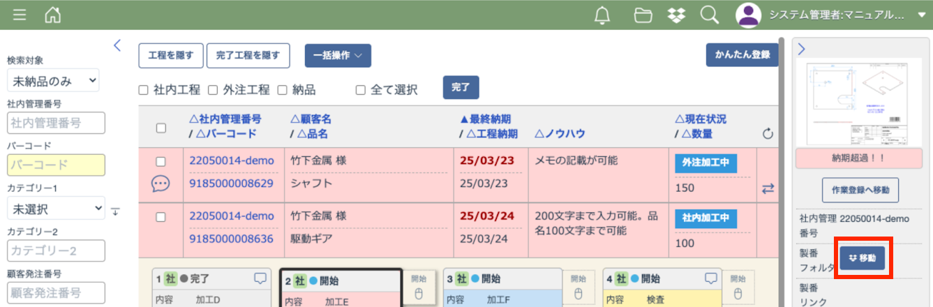 右側メニューにある整番フォルダ項目にある「移動」ボタンを押すとDropboxの画面を開くことができます。