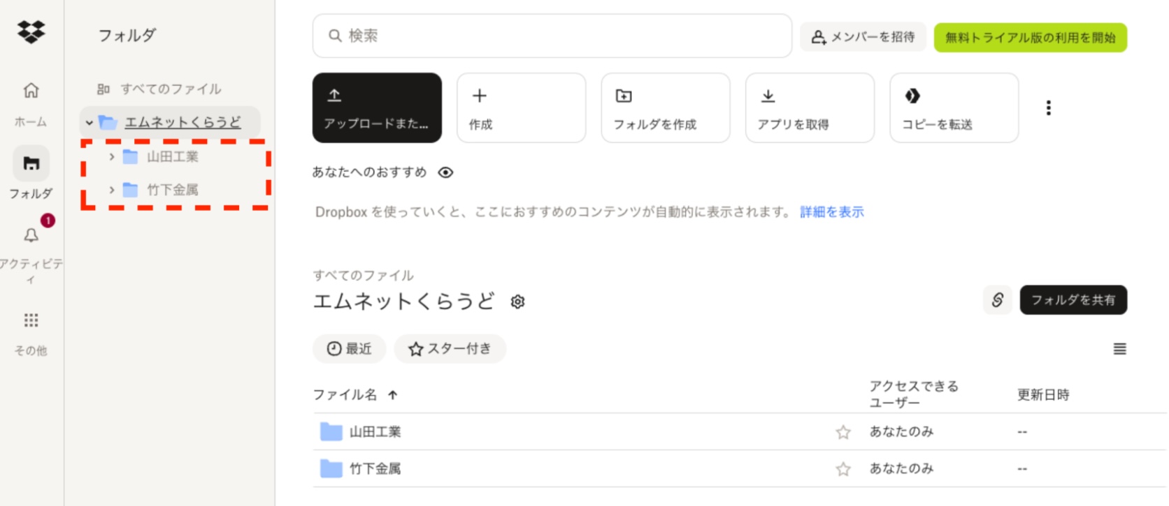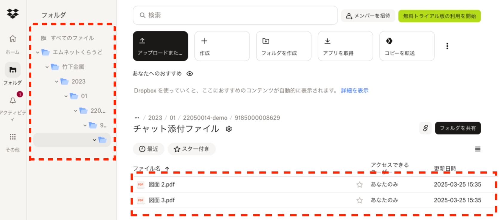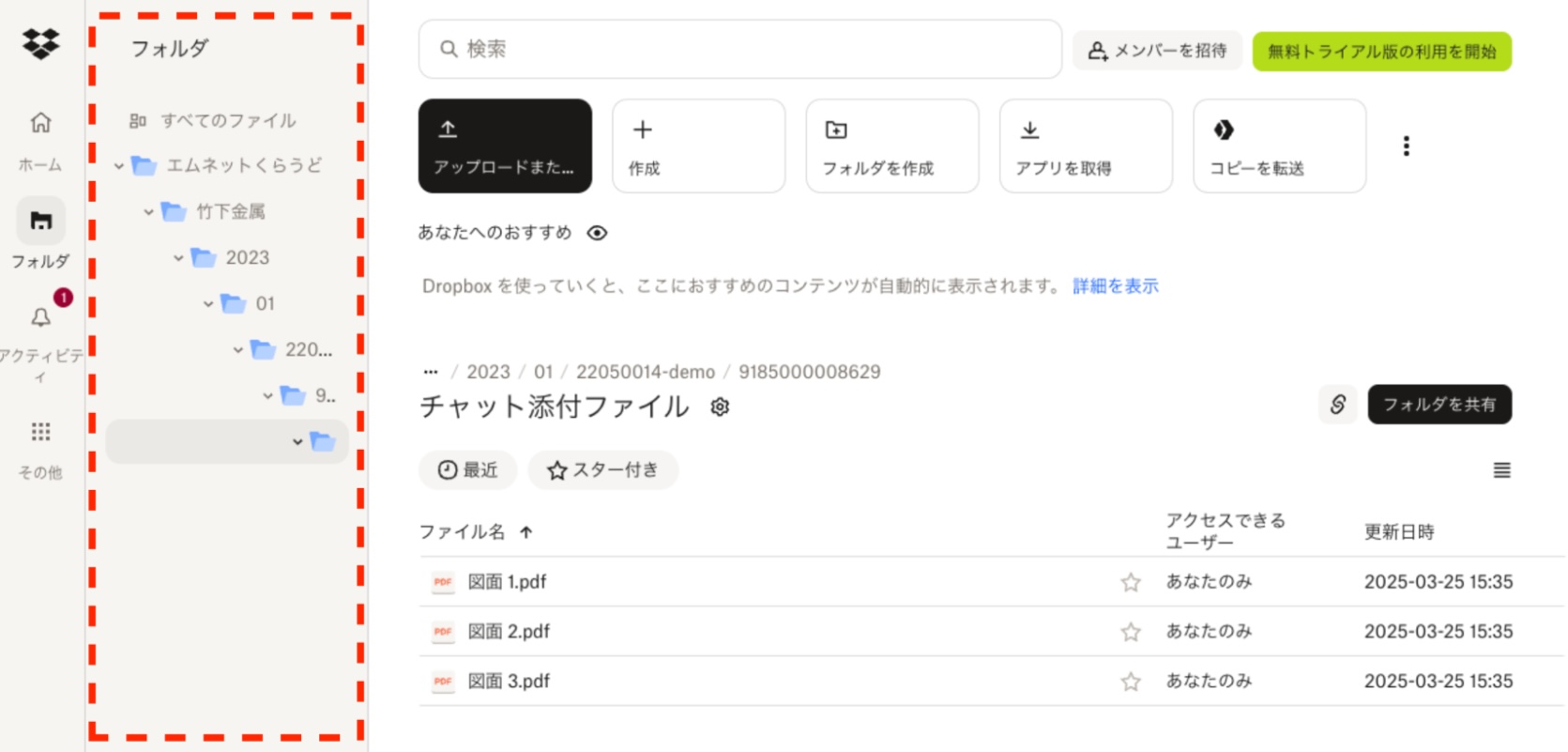 Dropboxに保存されたファイルは、Dropboxの画面左側メニューの「フォルダ」から確認できます。