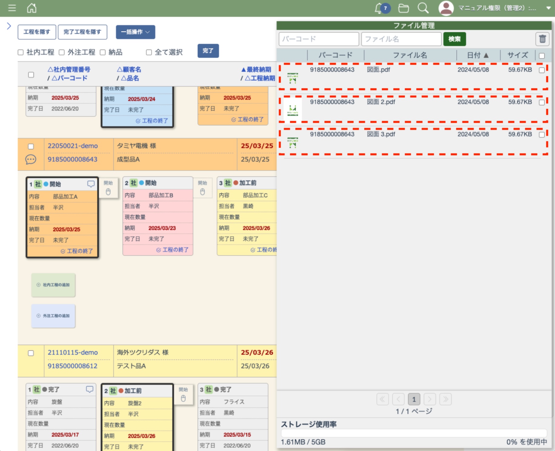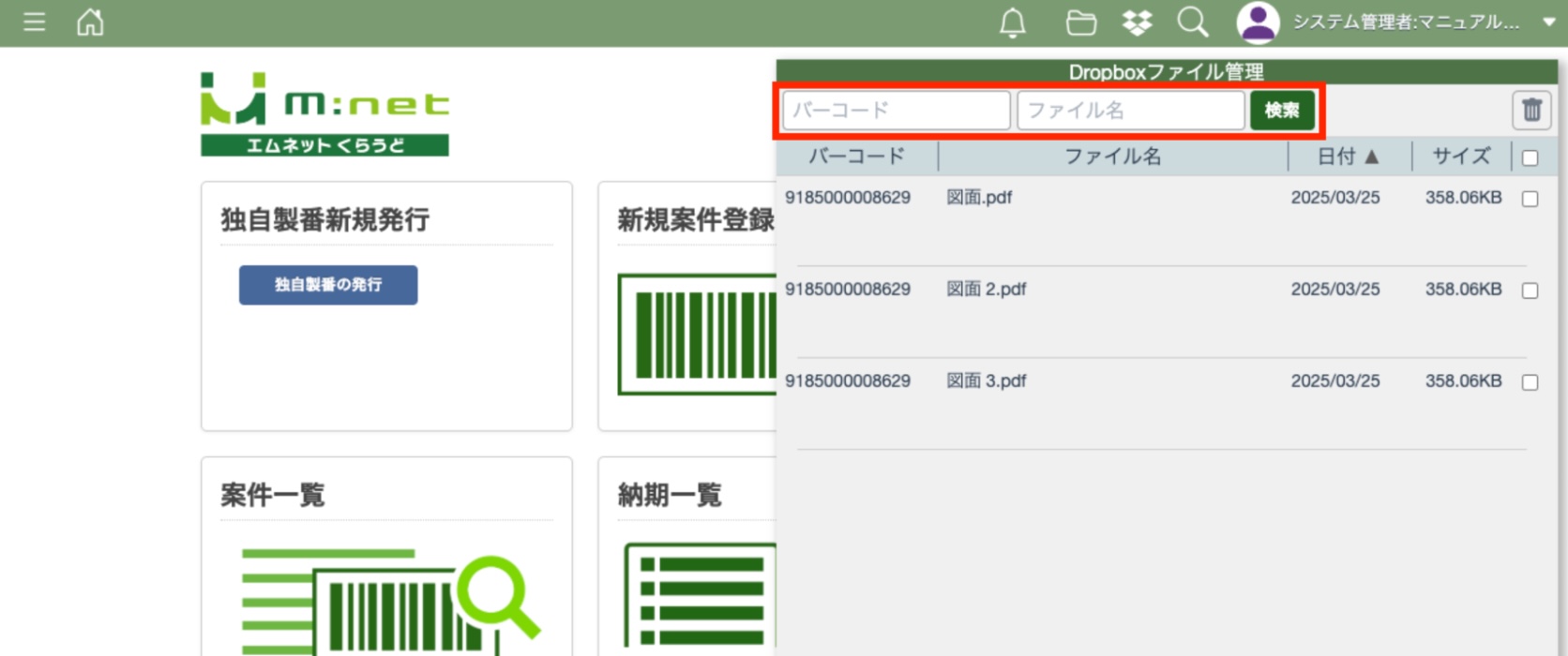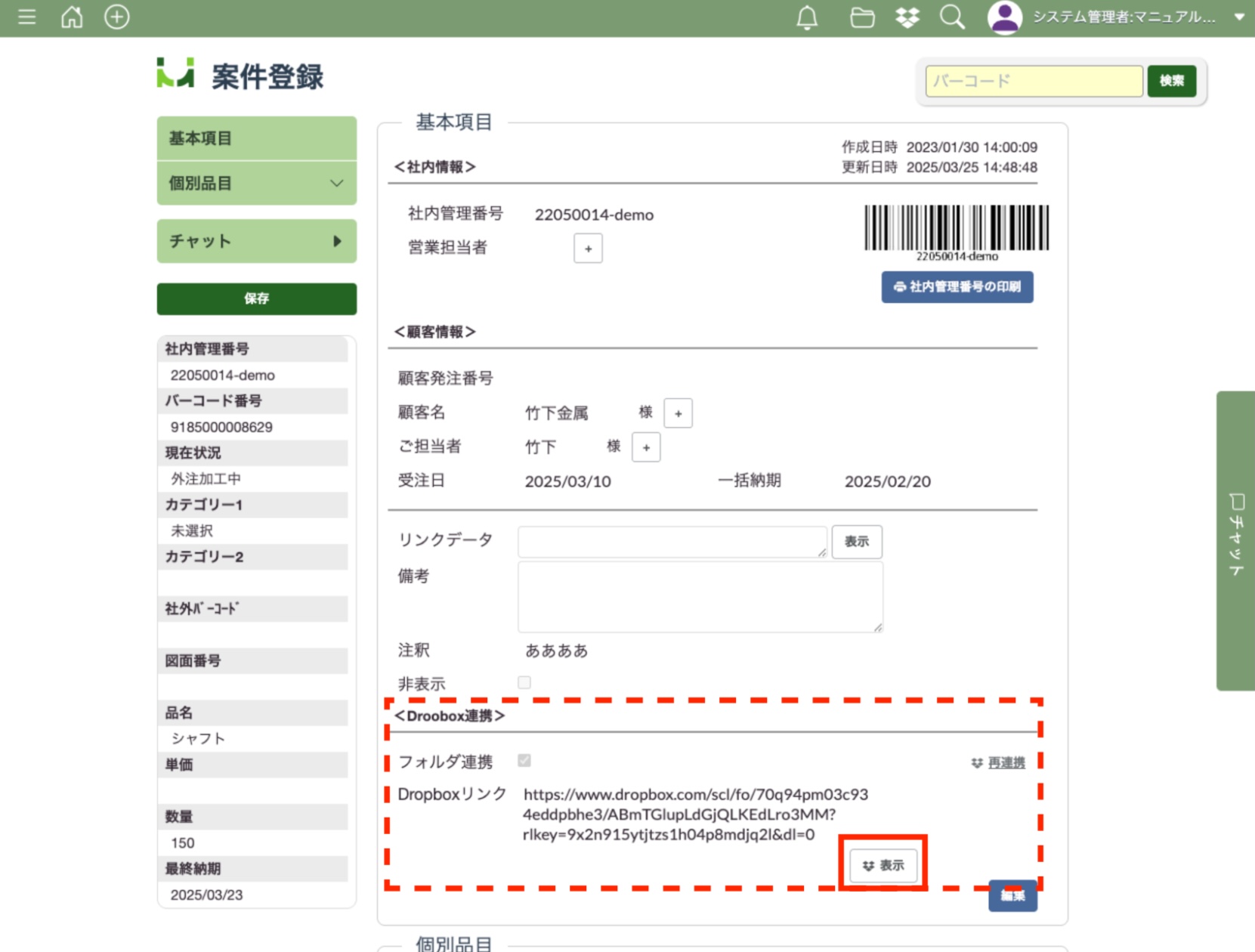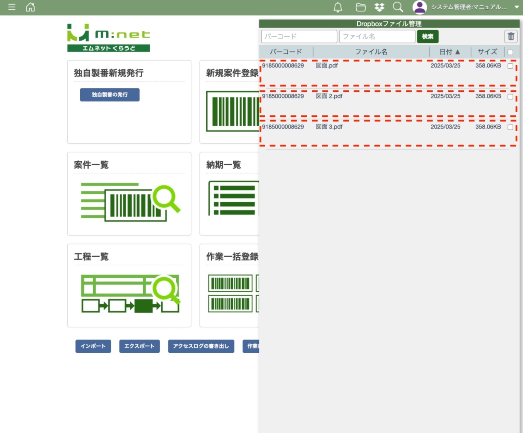 エムネットくらうど上(案件一覧・工程一覧から編集した時とインポートで書き換えた時)で社内管理番号や顧客名を変更した場合、Dropbox上のフォルダ名も追従するかたちで自動的に変更されます。