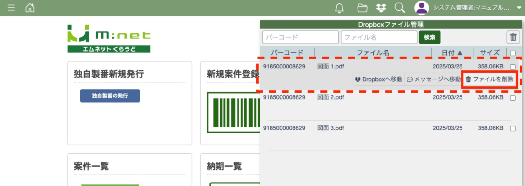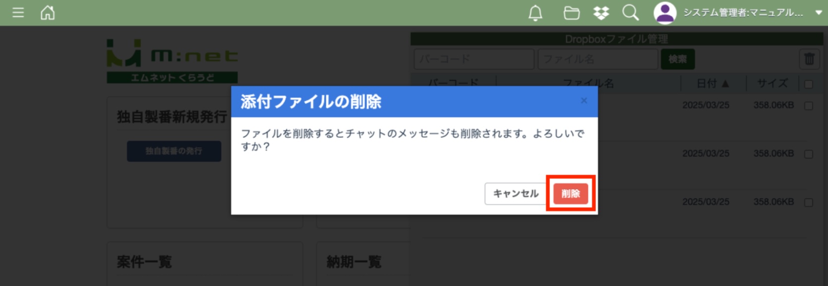 エムネットくらうど上で案件を削除した場合はDropbox上のファイルは削除されません。