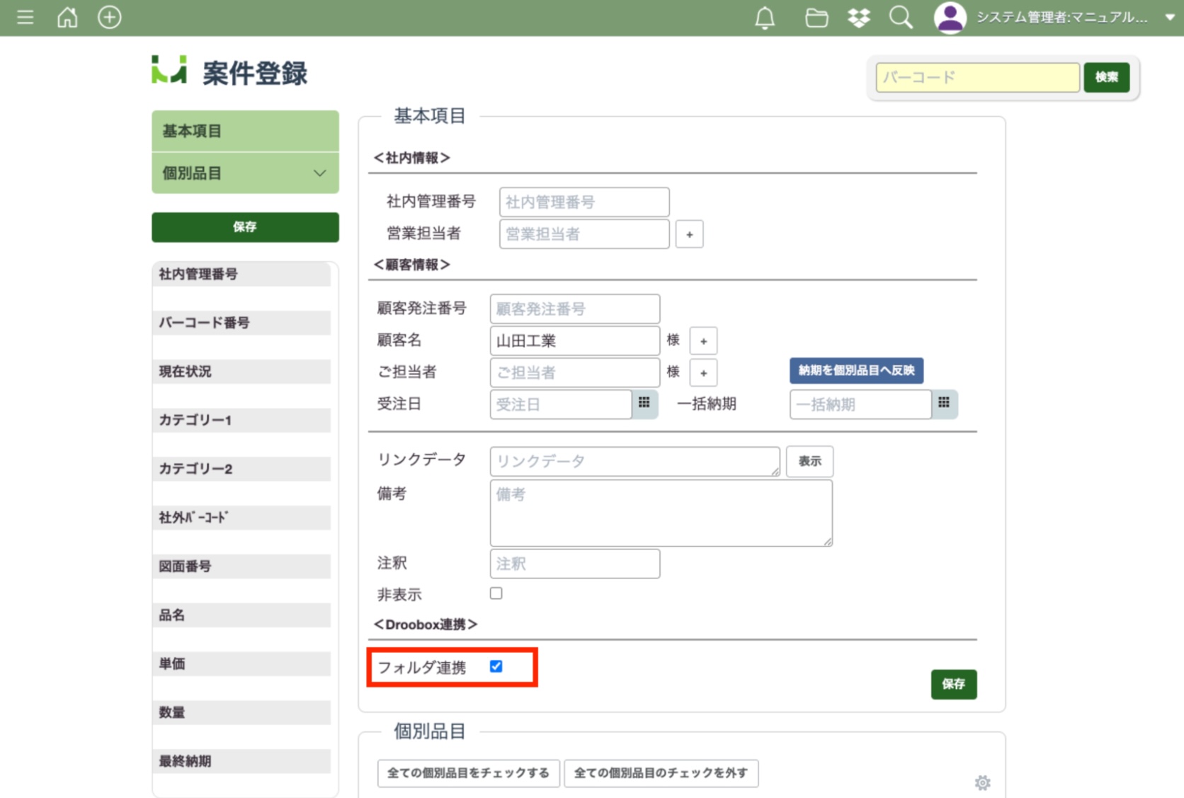 Dropbox連携を行うと、案件登録時に「フォルダ連携」の項目にチェックボックスが表示されます。