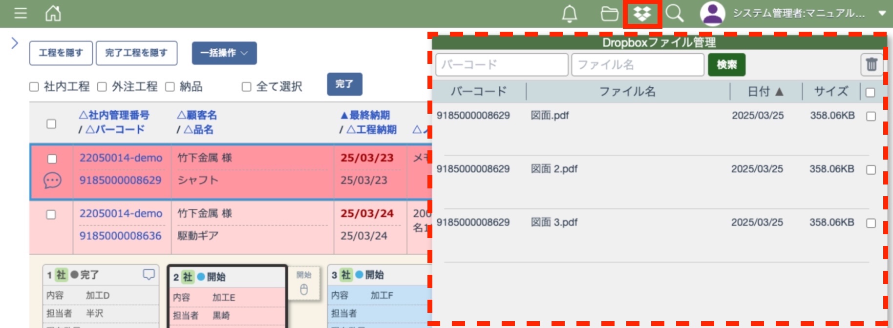 案件登録、工程一覧、ファイル管理の画面からDropboxを開く