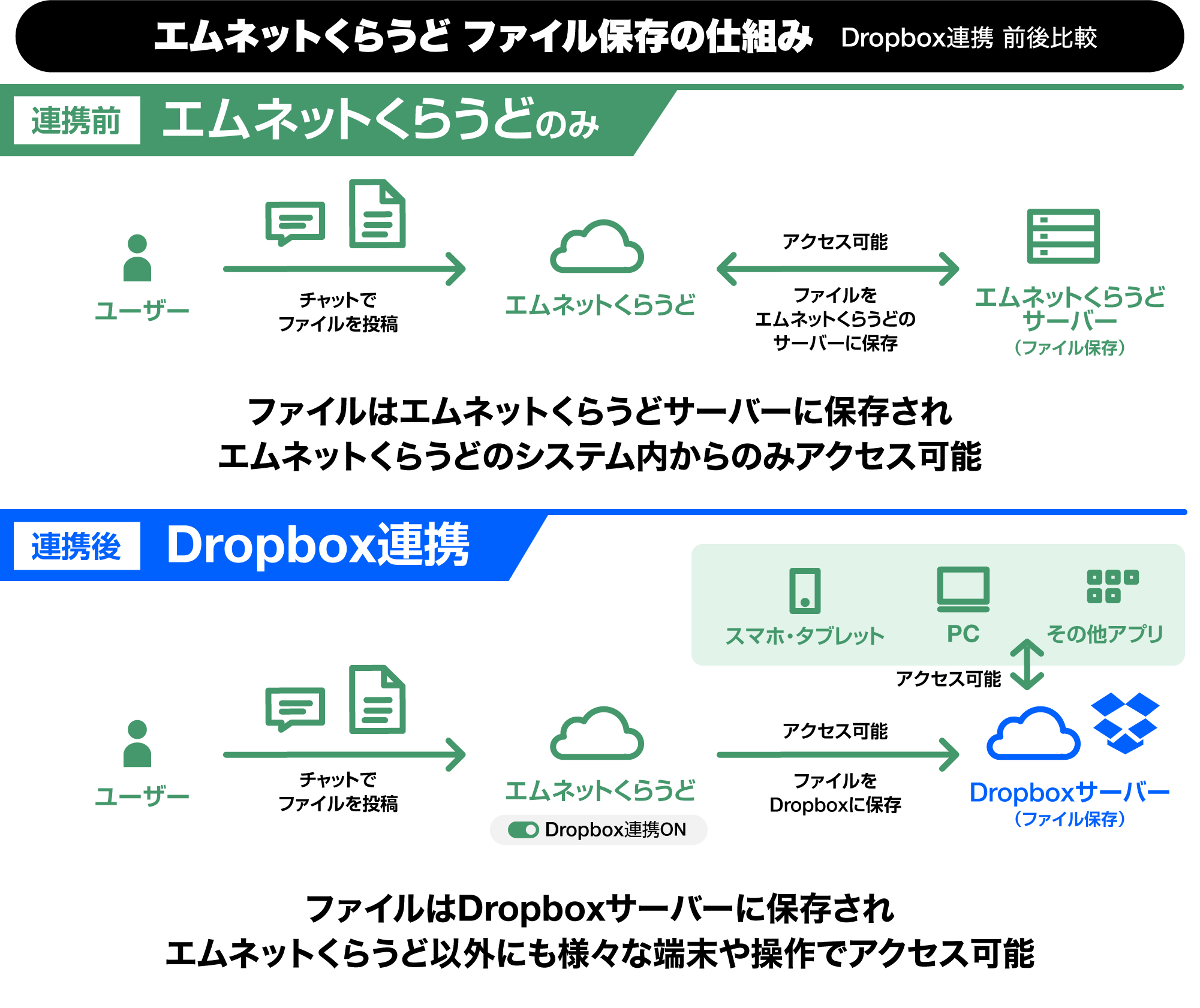 エムネットくらうどとDropboxを連携することでチャットに添付するファイルをDropboxに保存できるようになります。