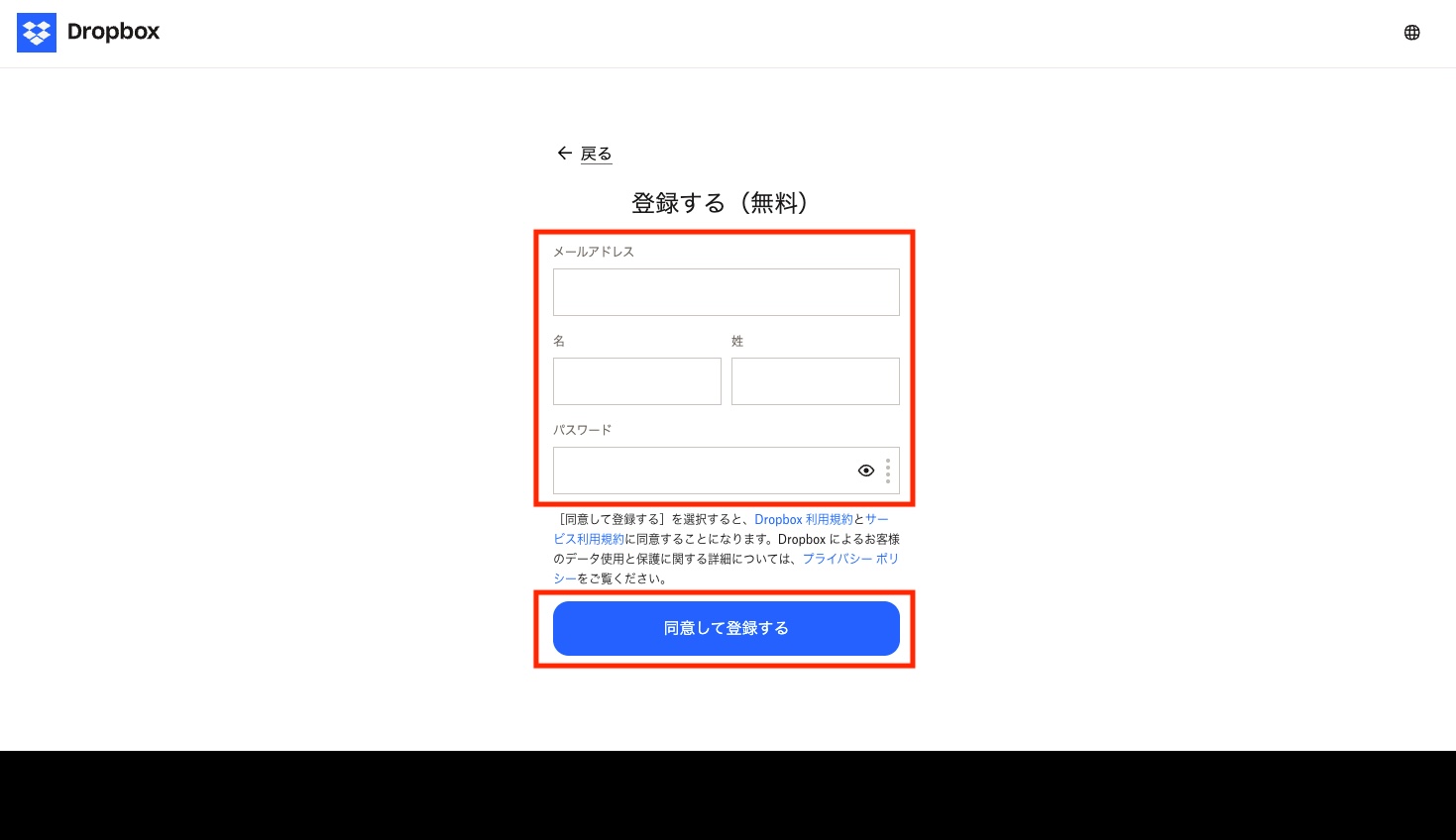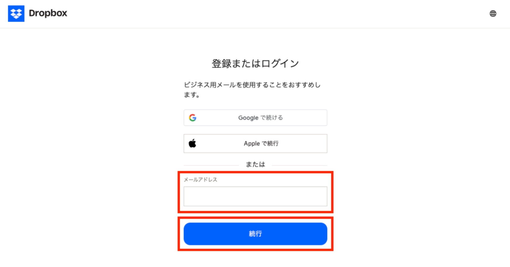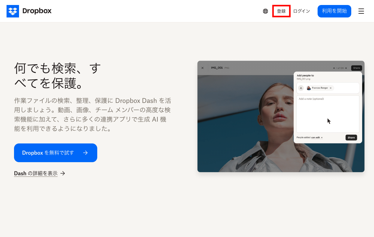 Dropboxの公式サイトにアクセスし「登録」を押してください。