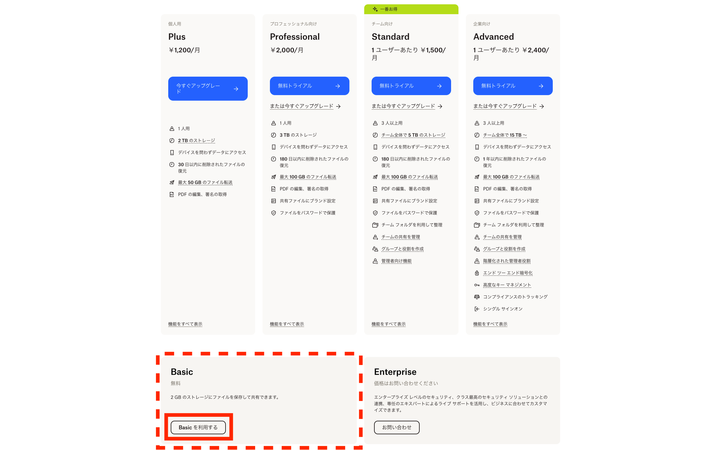 Dropboxには様々な容量のプランがあり、それぞれのプランに「無料トライアル」が用意されています。プランはあとからアップグレードができますので、ここでは無料の「Basic」プランから登録を進めます。画面の下部にある「Basicを利用する」ボタンを押してください。