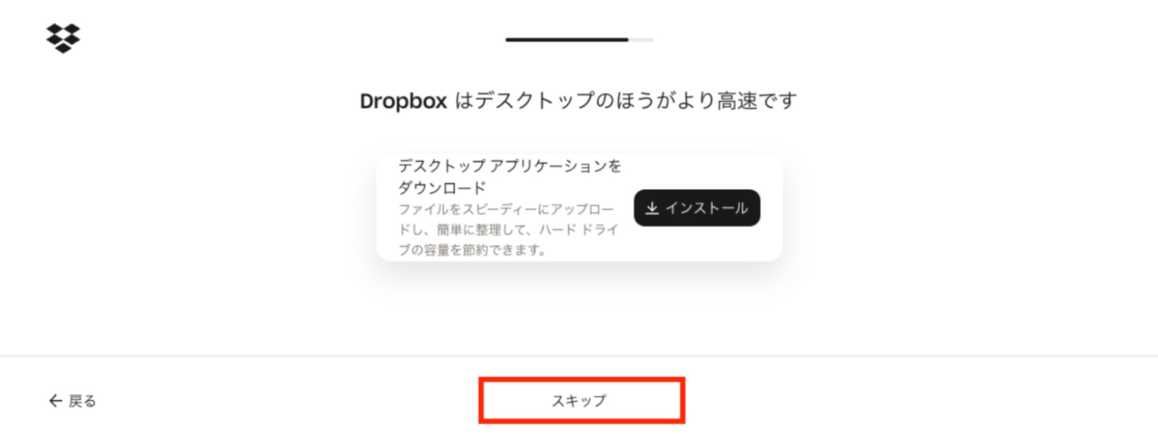 Dropboxはデスクトップアプリケーションでも利用できます。あとからインストールすることも可能ですので、ここでは画面の下部にある「スキップ」ボタンで先に進めます。