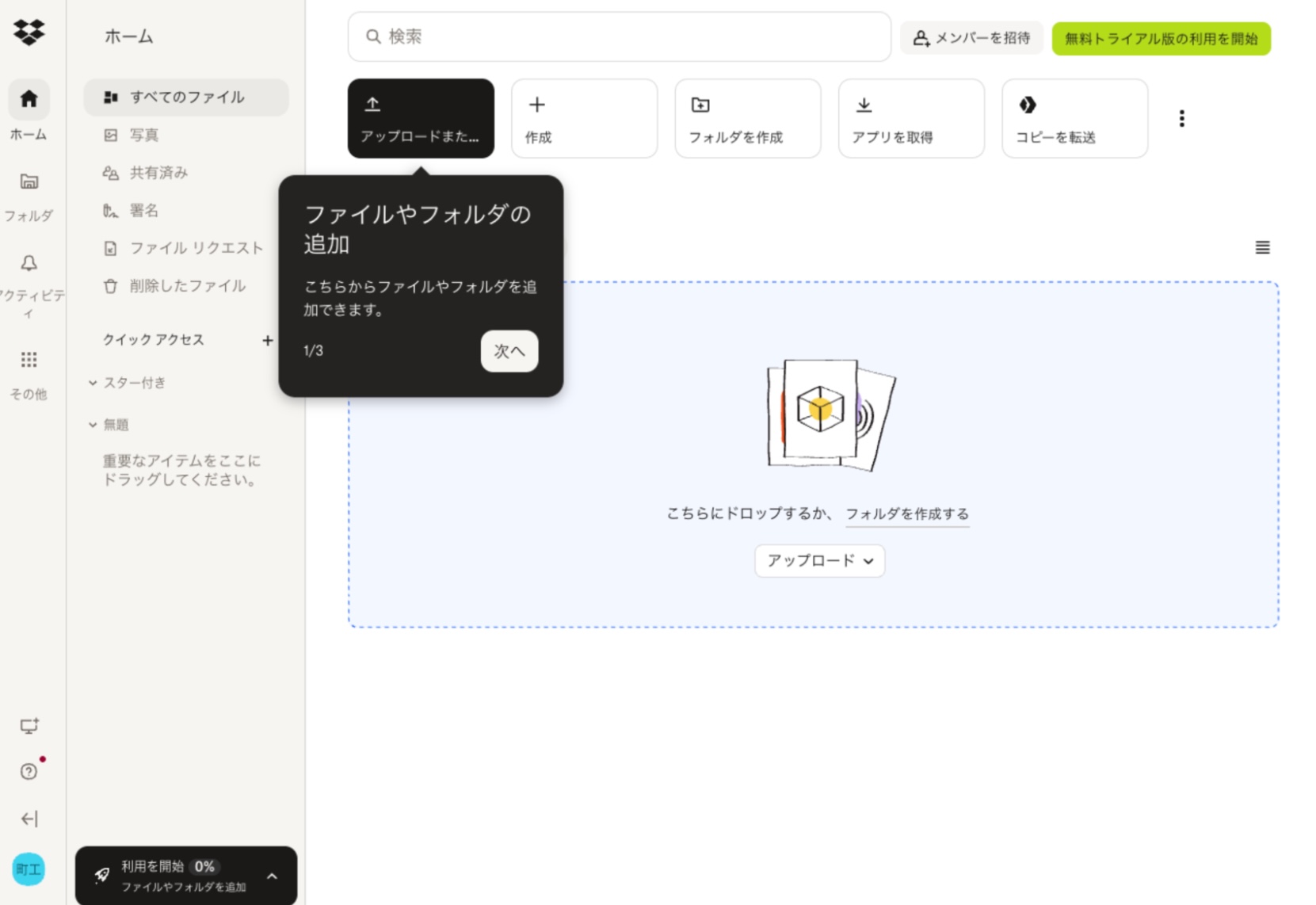 すべての設定が完了するとDropboxのホーム画面が表示されます。これでDropboxの登録ができました。