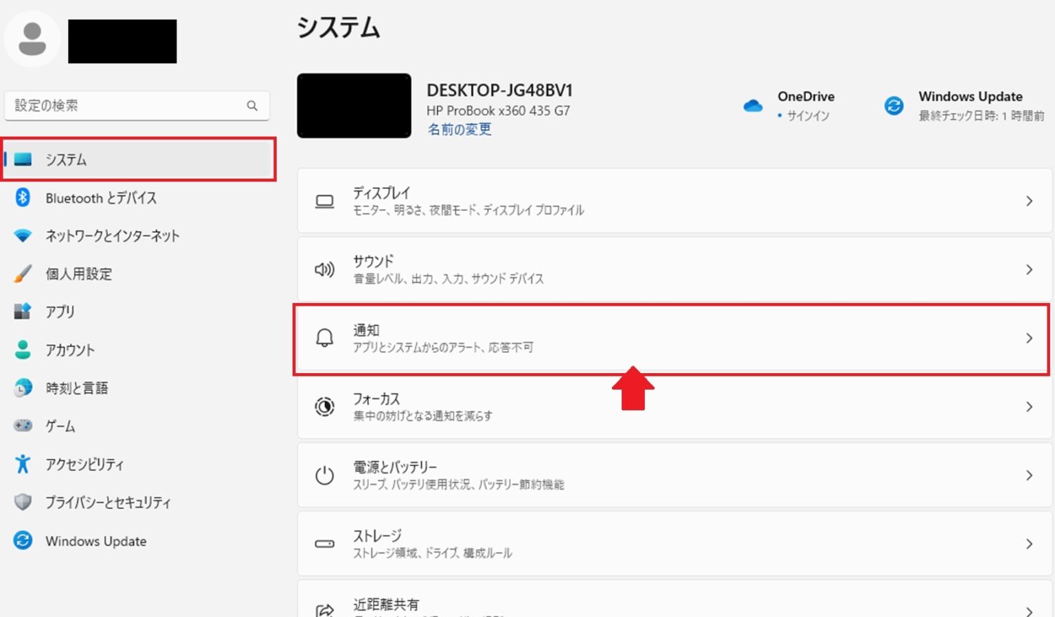 画面左下のWindowsマークをクリックして歯車マークを開き、左側のメニューの中から「システム」をクリックしてから「通知」の項目を選択してください。