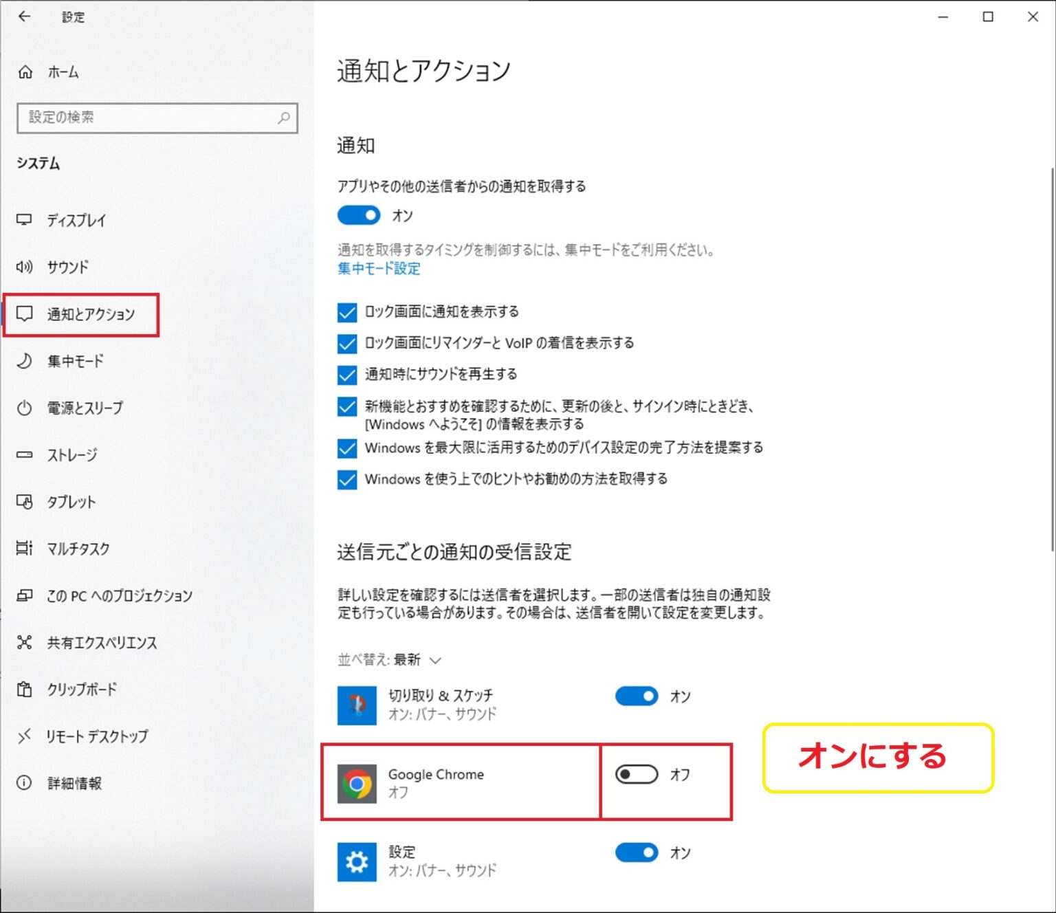 左側のメニューの中から「通知とアクション」を選択して、Google Chromeの通知設定をオンにしてください。