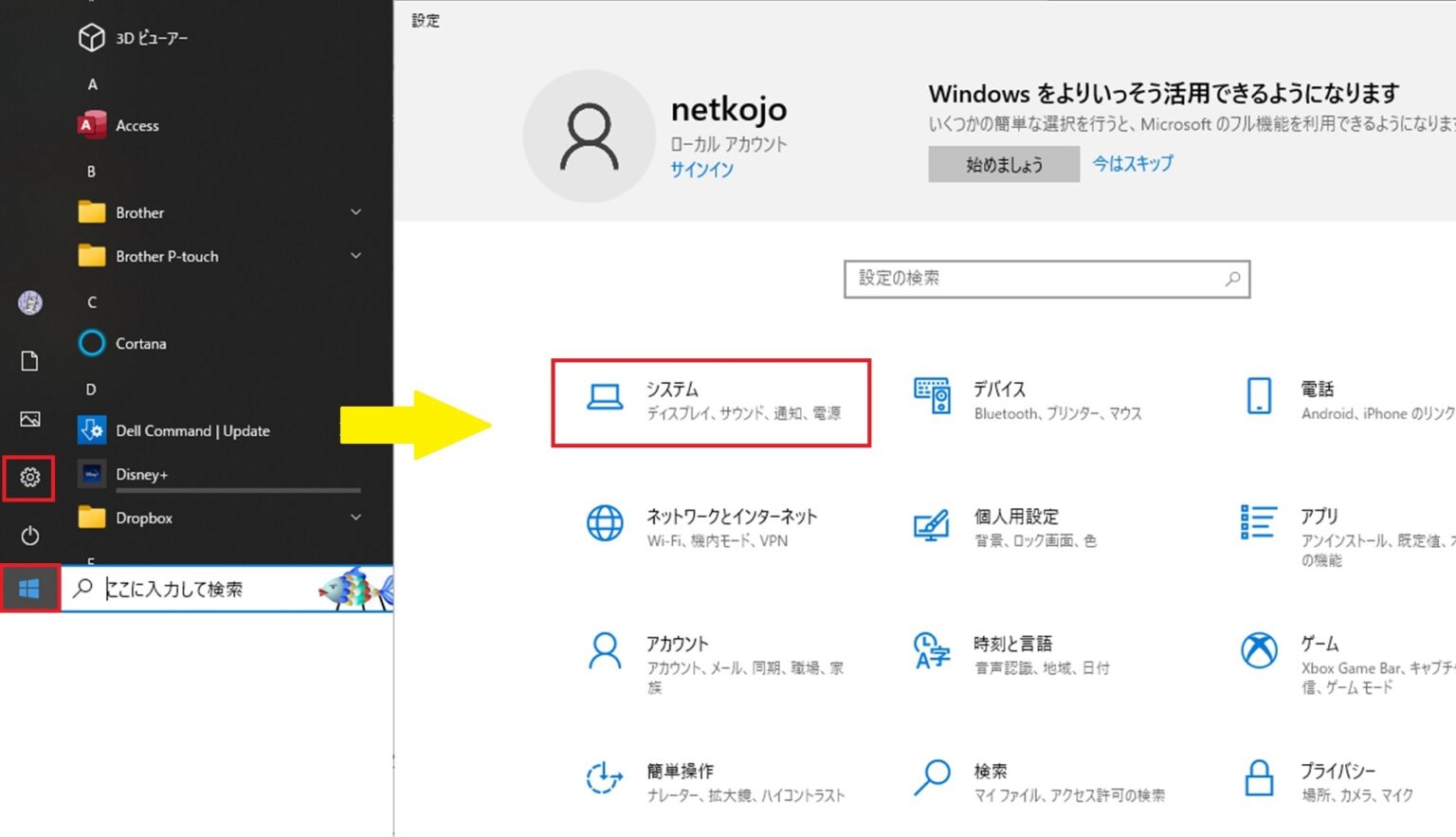 画面左下のWindowsマークをクリックして歯車マークを開き、メニューの中から「システム」を選択してください。