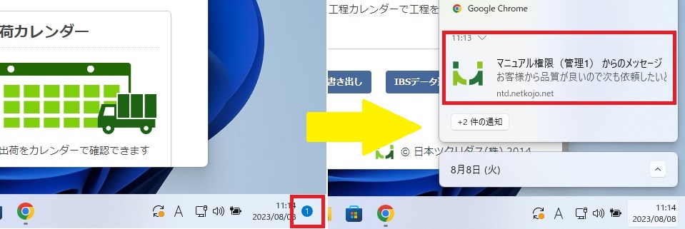 通知は一定時間で消えてしまいますが、画面右下の青丸の数字をクリックすると、受信したデスクトップ通知を表示できます。(下記画面はWindows11)