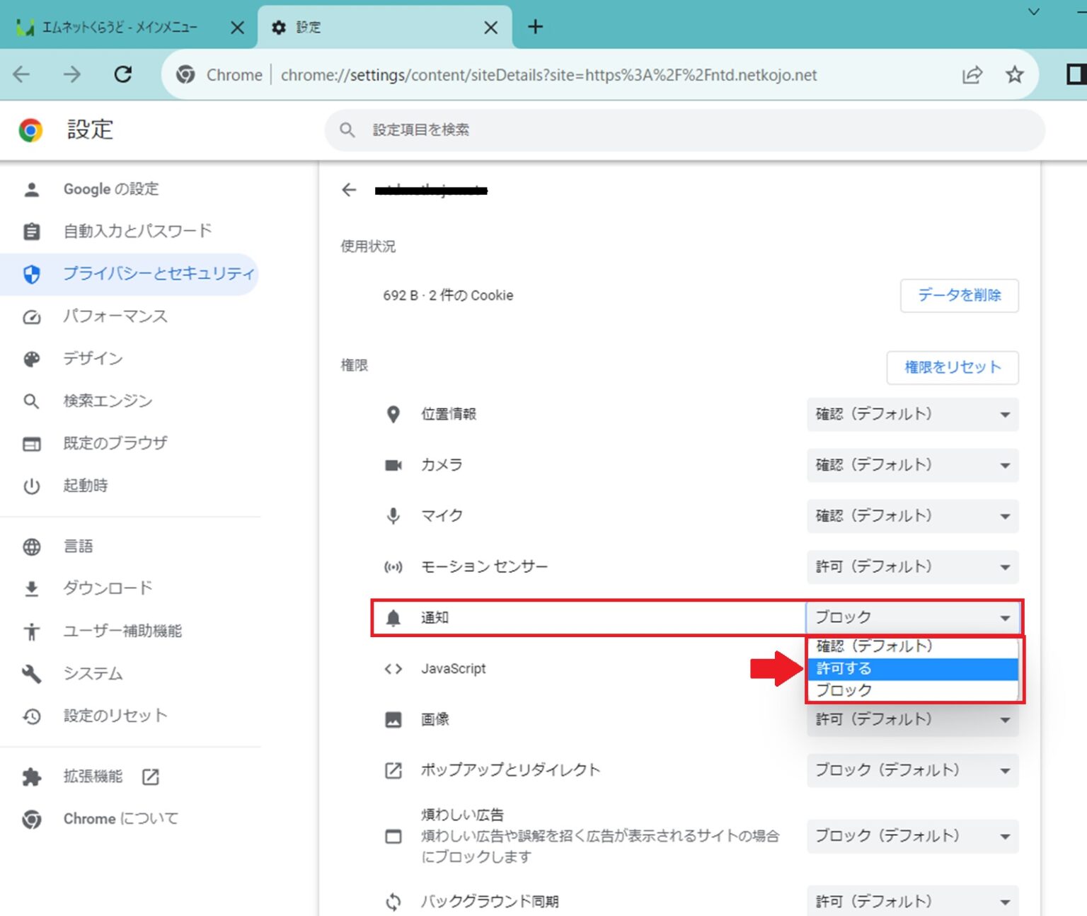 サイトの設定画面が開きますので、その中の「通知」を許可してください。