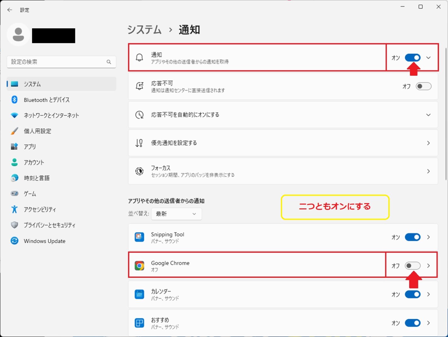 「通知」と「Google Chrome」の項目を2箇所ともオンにしてください。