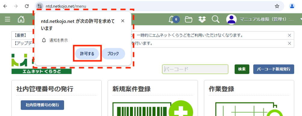 推奨しているWebブラウザ「Google Chrome」における通知設定についてご説明します。 エムネットくらうどにログインして、通知を許可するかどうかの確認が表示されたら「許可する」をクリックしてください。