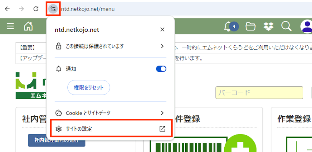 上記の動作をしても通知が届かない場合は、Google Chromeのサイトの設定を行います。 URLバー内の左のマークをクリックした後、「サイトの設定」をクリックします。