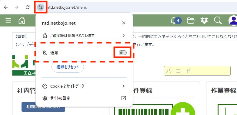 この設定はGoogle Chrome全体の設定変更のため、エムネットくらうど以外のサイトで通知を許可しているものがあった場合は、その通知も来るようになります。