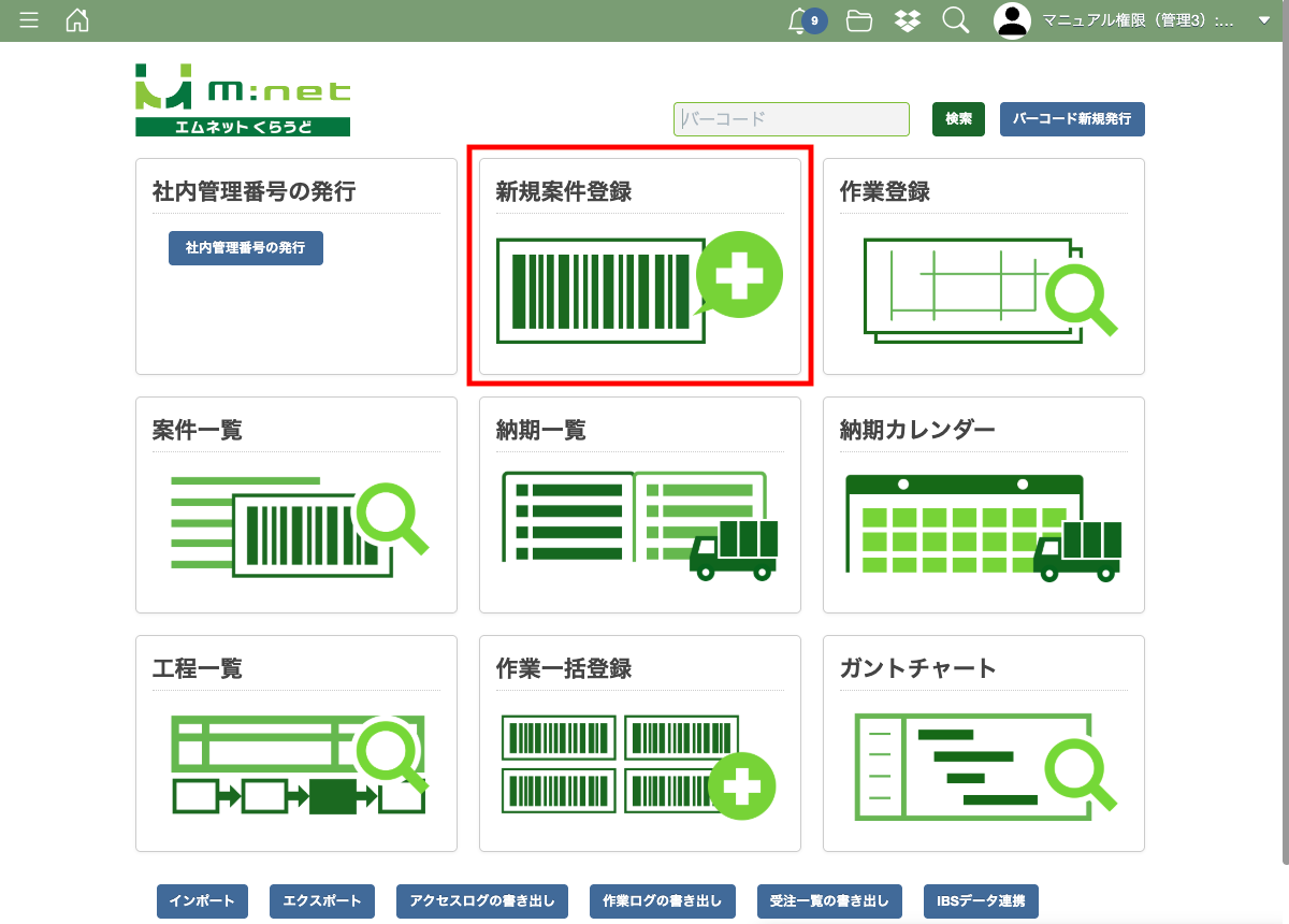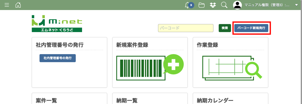 メニュー画面右上にある「バーコード新規発行」ボタンからもバーコードを発行することができます。