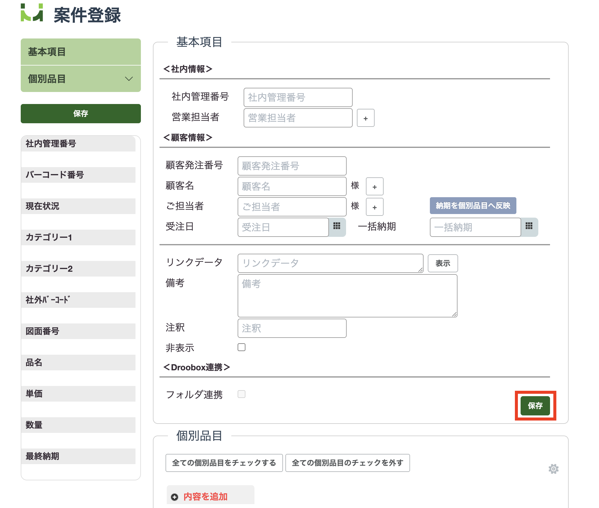 • 既存の社内管理番号を入力すると個別品目が追加されます。