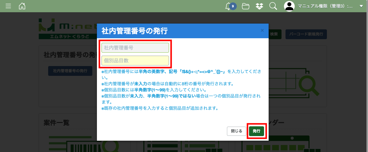 社内管理番号の発行画面が表示されますので、社内管理番号と個別品目数を入力して「発行」ボタンを押してください。どちらも空欄で発行することができます。