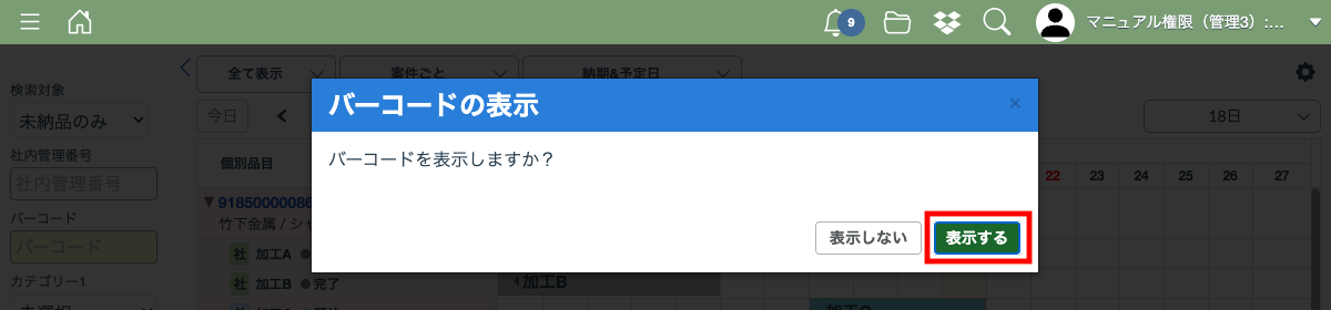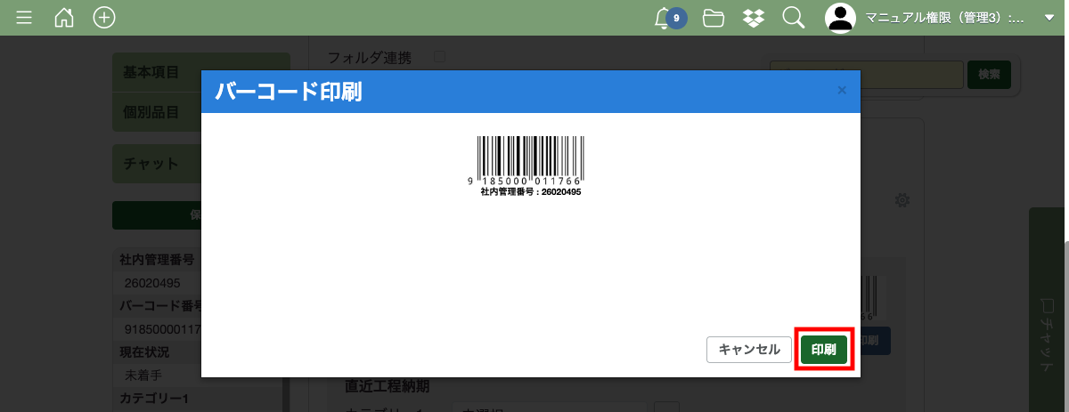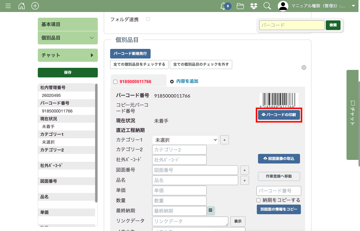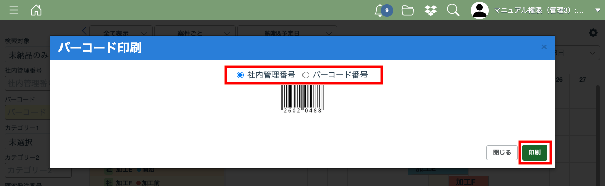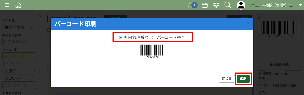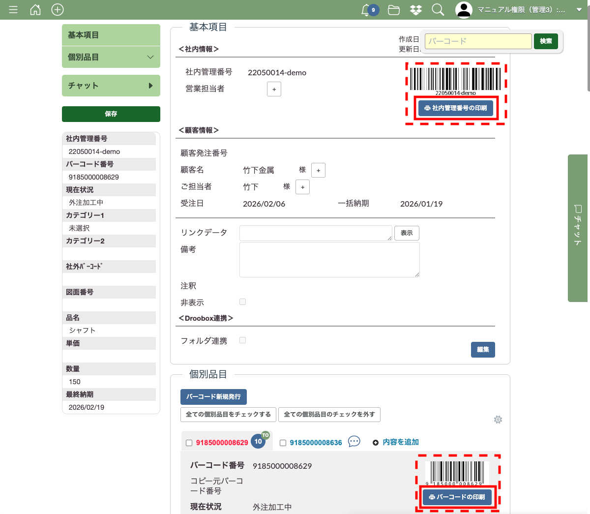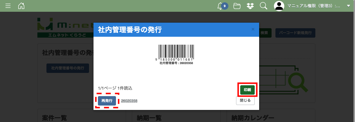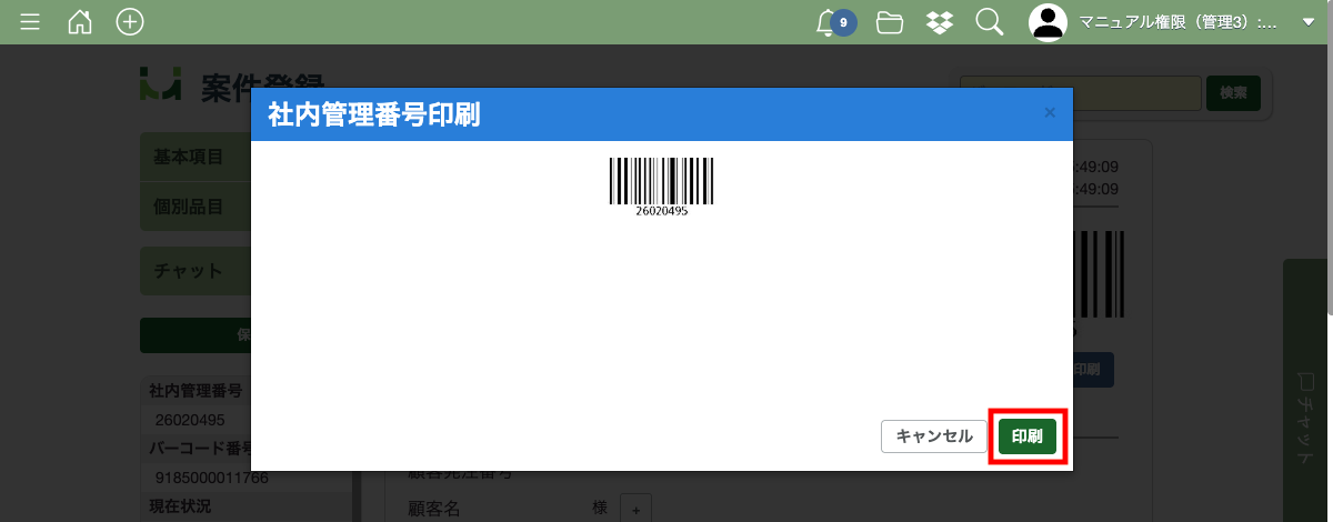 社内管理番号と個別品目のバーコードは、どちらも案件登録画面から何度でも再発行が可能です。