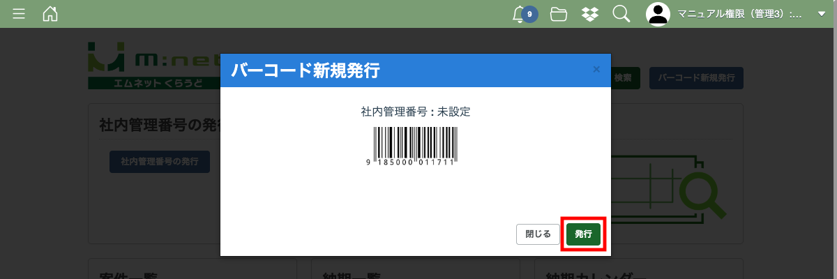 「バーコード新規発行」ボタンを押すと確認画面が表示されますので「発行」ボタンを押してください。