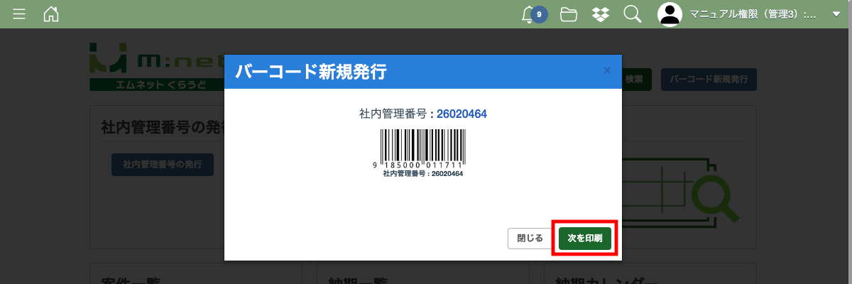 発行ボタンを押すと社内管理番号とバーコードが表示されます。印刷を行う場合は「印刷」ボタンを押してください。